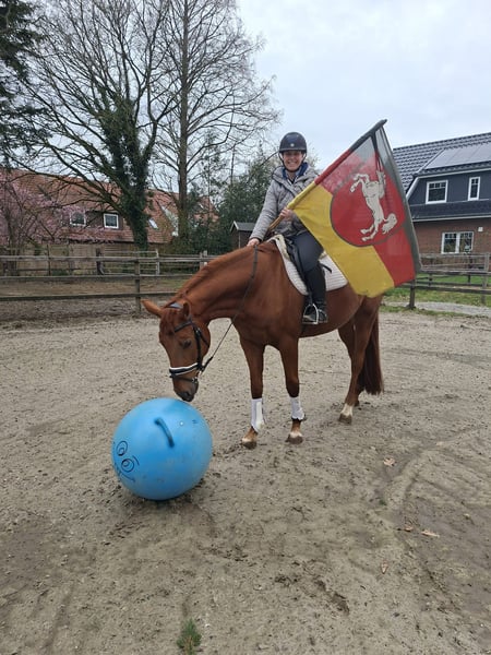"Final Countdown" ist ein imposanter Wallach, der sich im Viereck aber auch über dem Sprung zu präsentieren weiß. Letztes Jahr wurde er schonend angeritten und ist erst seit Anfang des Jahres regelmäßig unter dem Sattel. Er ist ein feinfühliges Pferd, welches die Abwechslung in der täglichen Arbeit, aber auch eine entspannte Runde im Gelände genießt!