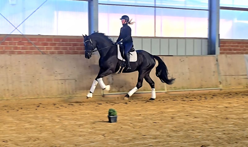 Daggy ist einen vielversprechenden Oldenburger Wallach, geboren im Jahr 2021. Der elegante Rappe besticht durch seine beeindruckende Größe von 172 cm und seine harmonische Erscheinung. Er ist ein top Dressurnachwuchs, der mit seinem angenehmen Charakter und seiner guten Grundausbildung überzeugt. Er zeigt viel Talent für die Dressur, mit seinem schwungvollen Trab und dem bergauf Galopp ist er sowohl für ambitionierte Reiter als auch für den weiteren Aufbau geeignet. Ein Pferd mit viel Potenzial, das auf Grund von Röntgenbefund, weit unter Wert verkauft wird.