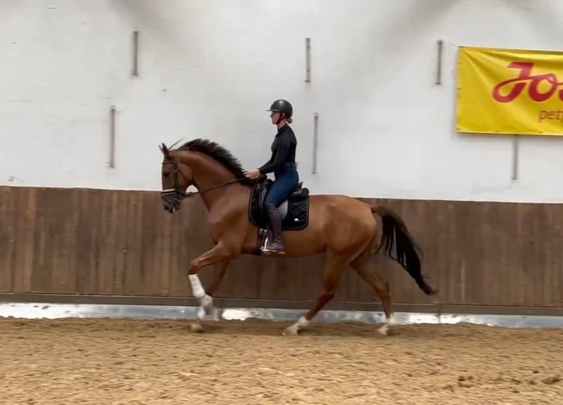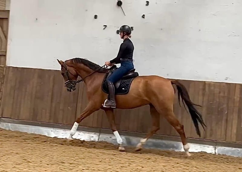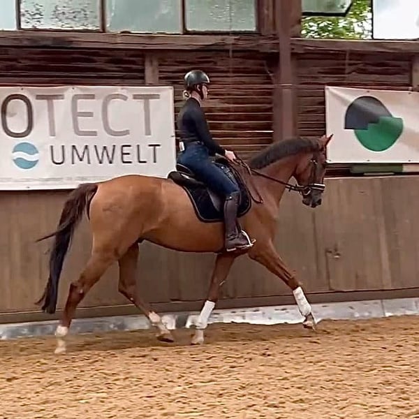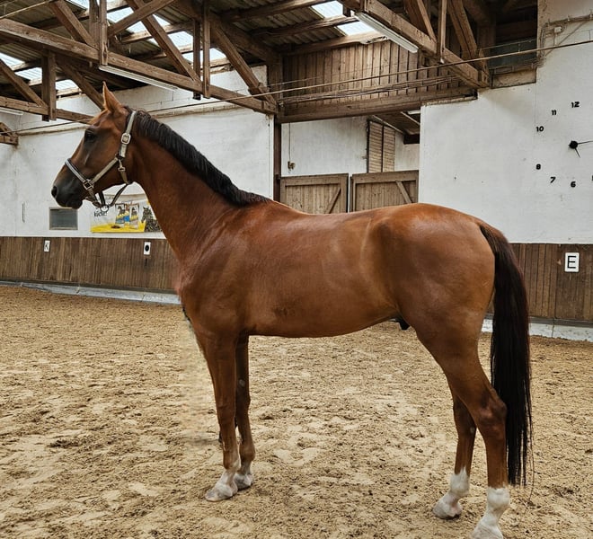 Well-behaved young dressage prospect from a dam who competed at the Bundeschampionat. He is currently in training and has not yet been shown in competition, but there are no obstacles to doing so. His grandsire (grandfather), VV Vivaldi, is among the top ten dressage sires worldwide. He is familiar with the arena, outdoor, and trail riding. Current veterinary certificate (TÜV) available (good condition). Please contact us by phone (WhatsApp) for inquiries.