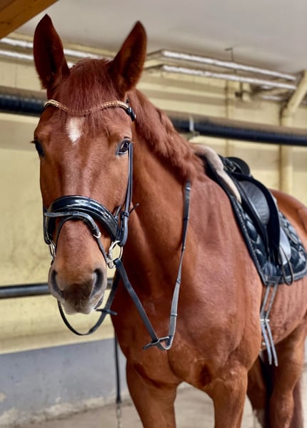 **Sale ad: Elegant Oldenburg gelding** An impressive Oldenburg gelding, born in 2020, is for sale. This charming chestnut not only impresses with his eye-catching appearance, but also with his outstanding potential in dressage sport. He was given plenty of time to grow. He was gently broken in at the age of four and has been professionally encouraged and trained ever since. He has four evenly high boots and a beautiful forehead mark. His dam is a sister to a two-time Olympian and from a proven Grand Prix line. He comes directly from a breeder and his siblings are also being promoted in the renowned stables. **Characteristics:** - Breed:** Oldenburg - Sex:** gelding - Year of birth:** 2020 - **Color:** chestnut - Height:** 178 cm - **Discipline:** Dressage This gelding is characterized by his elegant movement and friendly nature. He is ready to shine in dressage with his future owner and to be further developed. His potential and willingness to learn make him an ideal partner for ambitious riders. If you are interested, we look forward to hearing from you to share more information and arrange a viewing.