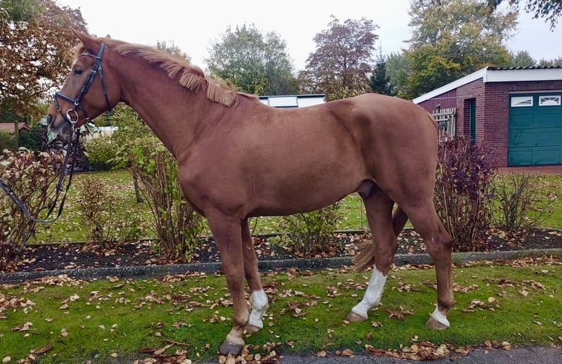 Oldenburg | Gelding | 2018 | 16.1 hh Lineage: Best of Gold × Alabaster This handsome dressage-oriented gelding is looking for a new, loving home. He moves well in all three gaits and has already shown himself to be brave over small jumps under saddle. He is well-behaved and affectionate in handling as well. Due to his age, he is best suited for an experienced and consistent rider. Perfect for an ambitious leisure rider. The farrier and osteopath visit regularly, and trailer loading is no problem. He is familiar with both box and open stall environments. We are seeking a new home for him because I simply have too little time to give him the attention he deserves. He can be lunged and ridden in the indoor arena at any time. Videos of him under saddle and over jumps can be gladly sent upon request. Price is secondary to finding the right home.