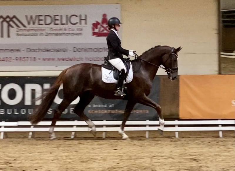 Verkaufe Oldenburger Wallach – Perfekt für die Dressur! Zum Verkauf steht ein eleganter Oldenburger Wallach, geboren im Jahr 2018. Mit seiner beeindruckenden Dunkelfuchsfarbe und einem Stockmaß von 171 cm ist er sowohl optisch als auch in der Bewegung ein echter Blickfang. Bereits in jungen Jahren war er erfolgreich auf der WM der jungen Dressurpferde, nominiert zum Bundeschampionat und Oldenburger Landeschampion. Mittlerweile ist er bis S ausgebildet und zeigt auch Talent für höhere Aufgaben. Ein Pferd das immer sicher um die 70% auf Turnieren läuft. Er besitzt das nötige Go, super schön zu sitzen und ist sehr brav und charakterlich wirklich sehr zuverlässig. Bei Interesse stehe ich gerne für weitere Informationen und eine Besichtigung telefonisch zur Verfügung.