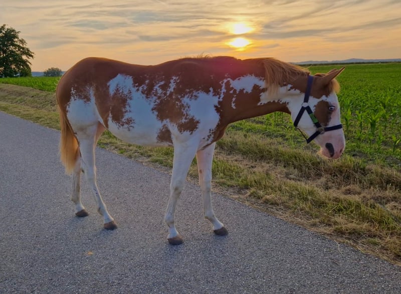 American Paint Horse Stutfohlen „Rio Rima Boon“ – traumhafte Abstammung! Aus Zeitmangel gebe ich mein wunderschönes Paint Horse Stutfohlen „Rio Rima Boon“ in beste Hände ab. Sie wurde am 07. April 2024 in Deutschland geboren und ist bei der American Paint Horse Association (APHA) registriert. Allgemeine Daten: • Name: Rio Rima Boon • Geschlecht: Stute • Geboren: 07.04.2024 • Farbe: Sorrel Overo • Eltern: • Vater: Listo Smoking Gun • Mutter: Miss Jessie Boon • Zuchtverband: American Paint Horse Association (APHA) • Besonderheit: Beide Augen blau Beschreibung: Rio Rima Boon ist ein sehr korrekt gebautes, neugieriges und aufgeweckte Stute mit toller Bewegung und ruhigem Wesen. Sie wächst artgerecht im Herdenverband auf, kennt Halfter, Putzen und bereits auch Bodenarbeit , das Arbeiten mit Stangen macht ihr besonders viel Spaß. Beim spazieren gehen, ist sie sehr unerschrocken und geht stets immer mutig voran. Durch ihre ausgezeichnete Abstammung eignet sie sich später auch mal für die Zucht. Rio gewann die PHCG Fohlenschau mit einer 8,05 und trägt den Vizechampiontitel des Bundeschampionats.