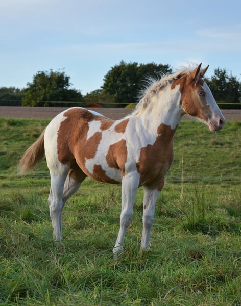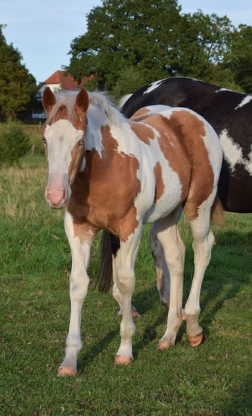 Hallo, sehr freundliches Paint Horse Stutfohlen " Docs Gold Rose - aka Rose" mit korrektem Gebäude, solidem Fundament und wundervollem, aufgeschlossenen Charakter. Sie wird später eine tolle Partnerin für Freizeit und Sport. Sie ist jetzt schon dem Menschen sehr zugewandt und freundlich. Daten zu Rose: Rasse: American Paint Horse Geschlecht: Stute Geburtsdatum: 05.06.2025 Farbe: Gold Champagne Tobiano 7 Panel N/N Geschätztes Endmaß: ca. 150-152 cm Abstammung: Vater: Indian Bigstep, erfolgreich geshowt in Reining, Stockmaß 1,54 m Mutter: Charmed Witch josie, Stockmaß 1,47 m Rose ist APHA registriert und das CoR liegt bereits vor. Der Equidenpass ist beantragt. Die Bilder sind von Ende September und von den ersten 3 Tagen. Die letzten beiden Bilder zeigen ihre Vollschwester (sold) im Alter von einem Jahr. Sehr cool und neugierig, aktuell mit einem Stockmaß von 1,41 m. Kann auch vor Ort besichtigt werden. Sie ist gesund und wächst artgerecht auf. Ist regelmäßig entwurmt und dem Hufschmied vorgestellt und wird geimpft. Beim Auszug kennt sie altersgerecht das Fohlen ABC. Transport könnte organisiert oder übernommen werden. Sie kann auch zur weiteren Aufzucht bleiben. Bei ernst gemeintem Interesse und Fragen gerne melden unter 01732090733. ☺️ Beste Grüße ☺️