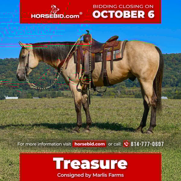 🍂 𝓐𝓾𝓽𝓾𝓶𝓷 𝑨𝑳𝑳 𝑺𝑻𝑨𝑹 𝑳𝑰𝑵𝑬𝑼𝑷 🍂 Happening now thru MONDAY | OCTOBER 6th - Available EXCLUSIVELY on HorseBid's website! For more details and to register visit: www.Horsebid.com CONSIGNOR CONTACT: Marlis Farms 814-777-0607 LOCATION: Rebersburg, Pa BREED: APHA REGISTERED: Yes REGISTERED NAME: Trashtotreasurecash COLOR: Buckskin HEIGHT: 15 AGE: 6 GENDER: Gelding “TRASHTOTREASURECASH” aka “Treasure” is a 6 year old, 15hh registered APHA gelding that truly lives up to his name as being a “treasure”. Pictures do not do this guy justice, he is BREATH TAKING in person! Treasure is “Mr. Personality” and the type of horse that would rather follow you in the house than be with the herd! He is the biggest love bug and will always leave a smile on your face! Not only is Treasure beautiful with a personality to match, but he is also extremely intelligent and very well educated under saddle! He is the most charming, kind, honest, fun, reliable and safe partner to have! In the arena, Treasure is very well balanced, his gaits are comfortable and his transitions are smooth. Treasure moves off seat and leg, but also listens to voices cues too! He rides English, western and bareback. As fancy as Treasure is, of course he comes with some buttons! He drops his head and will lope around collectively on a loose rein, he has a big stop and knows the word “woah”, he will back up, turn on his haunches, side pass and do a little spin! He is a BLAST to ride! Treasure is ready to hit the show ring and would really excel in the ranch riding classes, trail challenges or would be a beautiful western dressage horse! On the trails, Treasure is brave, willing, confident and super laid back! Not much rattles this guy! He crosses over logs, bridges, creeks and will ride up and down steep terrain! He is traffic safe and unbothered by scary objects like bikes, tractors, heavy equipment, SXSs, ATVs, horse drawn carriages, etc! He is not buddy or barn sour and can ride out alone or with a group and is happy anywhere in the pack! At home, Treasure is a really easy keeper on a simple forage based diet. He requires no maintenance or supplements, and can live inside or outside. He never complains as long as he’s getting love and attention! Treasure is polite with wonderful ground manners and is very well mannered for the vet, farrier and dentist! He loads and travels great and always stands tied quietly and patiently at new places! Treasure is good for all the normal barn tasks including bathing, clipping, grooming and tacking up. I never have to worry about who handles this gelding in the barn as I trust he is going to be good for kids and beginners! He has that “old soul” vibe to him and really loves being around people and children. Everyone who meets Treasure falls in love, he is truly one of a kind! Remember, wherever your heart is, there you will find your treasure!