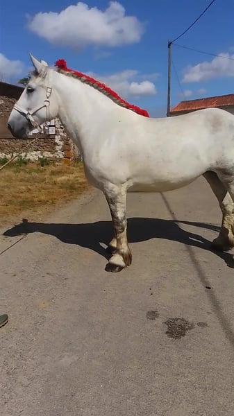 Yegua de 6 años de tamaño pequeño, inscrita en el libro de cría de Percheron. Es una yegua que está comenzando a trabajar en el arado y es adecuada para una persona con experiencia. Es una yegua muy verde en el trabajo y necesita confiar en su jinete. La yegua deja los cascos, tiene herraje a la inglesa y sus vacunas están al día contra la gripe y el tétanos. Carga muy bien en el camión, pero no en la furgoneta. Vive en manada.