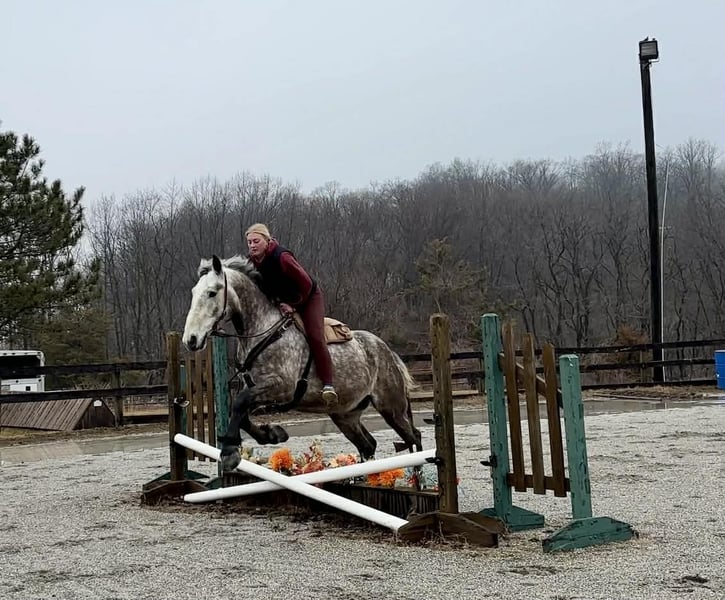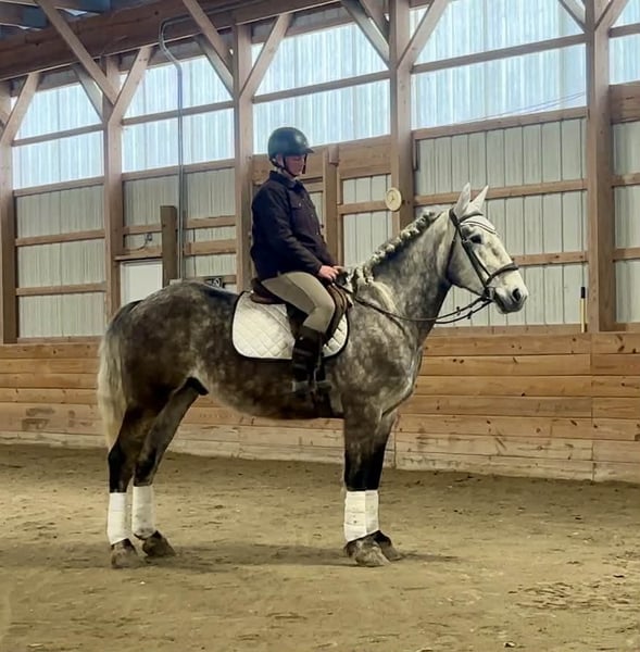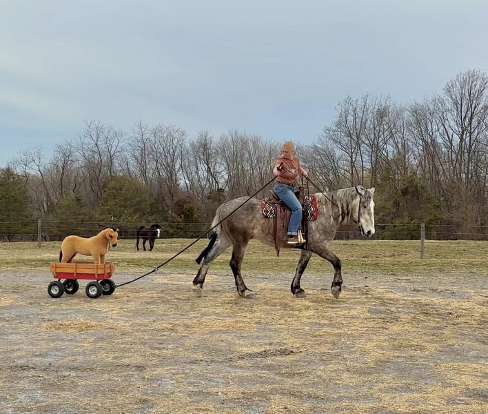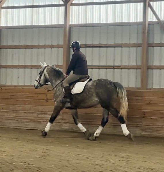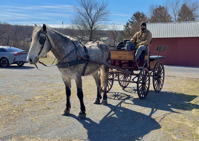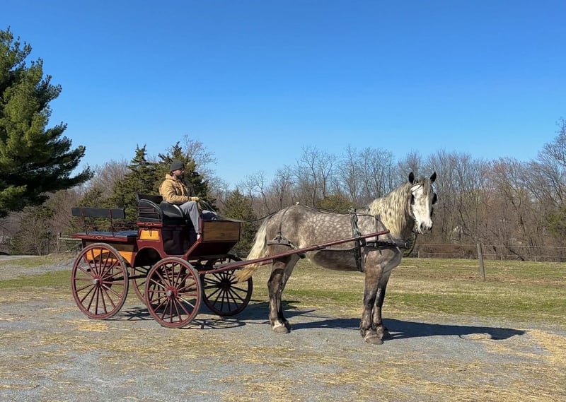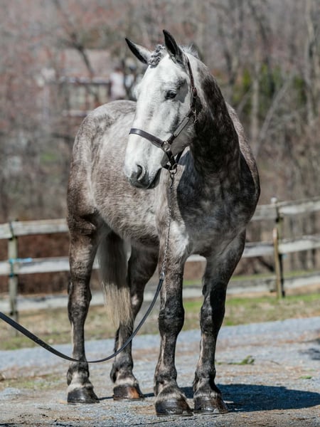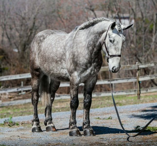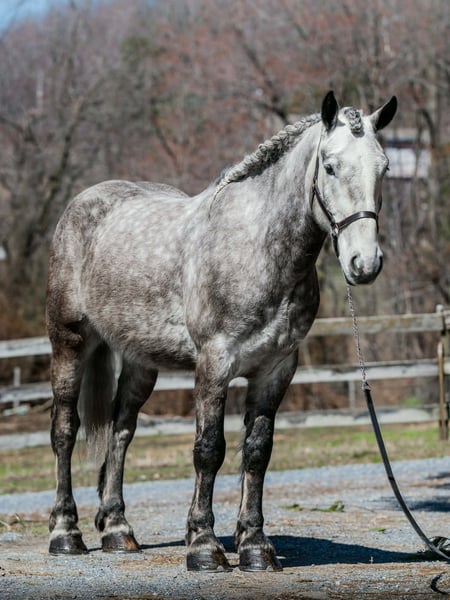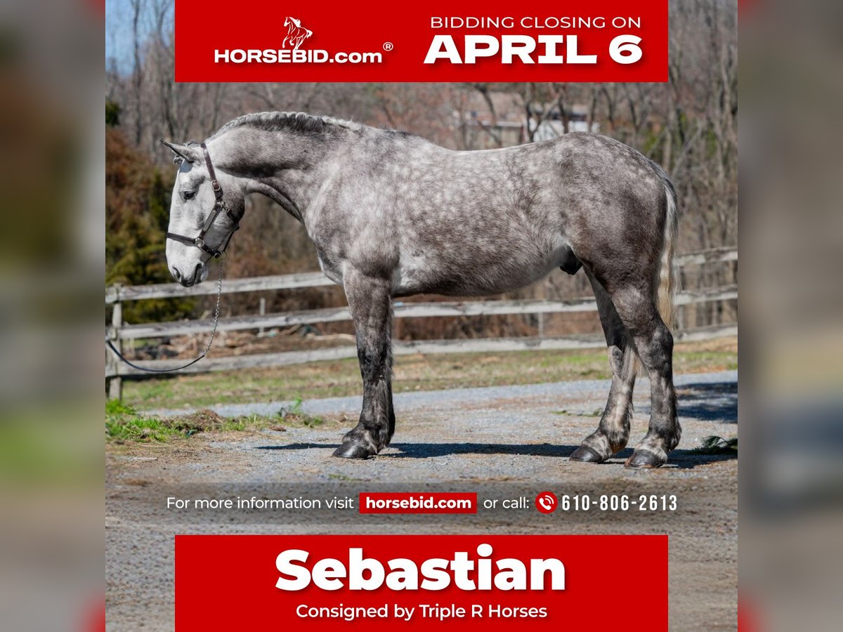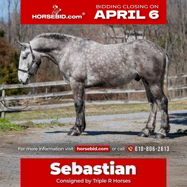 🌟𝑨𝒑𝒓𝒊𝒍 𝐀𝐋𝐋 𝐒𝐓𝐀𝐑 𝐋𝐈𝐍𝐄𝐔𝐏🌟 Happening now thru MONDAY | APRIL 6th - Available EXCLUSIVELY on HorseBid's website! For more details and to register visit: www.Horsebid.com CONSIGNOR CONTACT: Triple R Horses 610-806-2613 LOCATION: New Holland, PA BREED: Percheron/Friesian REGISTERED: No REGISTERED NAME: Sebastian COLOR: Dappled Grey HEIGHT: 16 AGE: 4 GENDER: Gelding “Sebastian” is a 4yr old, 16hh, Percheron/Friesian cross gelding, with the sweetest personality, and a face that you simply can not resist! Don’t let his age deter you, Sebastian is an old soul, who longs for love and loves his people. If you are looking for safe, reliable, fun, and an ultimate all arounder, here is your boy!!!! This boy is sturdy and compact, yet not a monster in height, making him very versatile and friendly for smaller set ups. Sebastian is an amazing trail partner, and would make a great husband horse! This boy rides and drives, and he is a certified sweetie pie. In the barn, Sebastian has zero bad habits. He never complains and doesn’t mind if he is alone or has buddies. He can live in, or out, gets along super well with others and is gentle in a mixed herd. If you are present in the pasture, he will find you and come ask for attention. He stands on the cross ties to be groomed, braided, tacked, etc. He has zero bad habits or stall vices and is as quiet as a mouse in his stall. Sebastian has good ground manners and is safe for beginners, and kids to work around. He is safe with my pups running all around him, and doesn’t mind commotion in the barn. Sebastian is an amazing trail partner. He is quiet, easy going, and brave. He is the perfect mixture of laid back and adventurous. He will walk around all day long on the buckle and follow the group, or take the lead and go off grid pushing through the woods. Sebastian crosses water, logs, bridges, rocks, and is safe with traffic, machinery, bikes, dogs, you name it. He is happy to stop and let hikers pet him. He will ride in the lead, middle, back, and is willing to leave the group and go off on his own, with that, he definitely has the mentality to be a great fox hunter. Drop your reins and enjoy the ride, he will mosey right along. But he is not a dead head and pays attention to his footing, he knows to shift his weight going downhill, takes care of his rider on narrow cliff sides, and is willing and happy to move out asked. You can trot or canter then ask him to come right back down to an easy walk. He would make an awesome mount for someone who is looking for a camping partner, mountain horse, or hunting. He is patient and happy to stop and stand when you ask. On one trail ride, we came across mountain climbers, he didn’t bat an eye at them up above his head, instead he looked up, and watched them, almost in awe. Sebastian ties to the trailer quietly while getting ready, and he is the same horse in new places. This boy is very reliable and the same horse every ride. He loads and trailers well, and fits right into my normal size horse trailer. He is the type of horse that you can throw your husband on and pack his saddle bags full of beer. Go and enjoy the ride! Sebastian rides western, english, bareback and in a plain snaffle. He has very comfortable gaits, and listens great to voice commands. He has a smooth, lofty, canter, in fact one of the most comfortable canters I have ridden on a draft cross. Give a kiss and he will pop right into a lovely canter with smooth transitions. You can adjust his trot from slowwww and pokey to, a more extended trot. He is the perfect combo of whoa and go, he is happy to be lazy and slow yet you don’t need a crop or spurs to ask him to go to work. He is light in your hands and learning to move off of leg. Say “whoa” and he will stop. Sebastian is extremely smart and enjoys learning. He is always happy and doesn’t get upset with his rider. He is the same horse every ride and does not need to be in a routine. Climb on and go have fun. In the ring Sebastian will walk, jog, trot, canter and is learning his leads nicely. He naturally picks up the correct leads every time. While he is still considered green in the arena due to most of his time being spent hacking or trail riding, he is extremely willing, and loves to please his person. He enjoys ring work and learning. This guy has such an amazing brain already, and he is only going to get better. Sebastian has had a light and easy start to life and he takes everything in stride as if he’s done it before. He has not been pushed, and has been worked appropriately for his age. I have not pushed for collection, he is naturally soft in your hands. The videos you see of him trotting ground poles, that was the first time I asked him, you can see him use his brain and figure it out. While drafty, Sebastian is agile and light on his feet. He is not a clumsy, pluggy, no thoughts type of horse. Due to his age, he has only been introduced to jumping recently and has not jumped a lot. The jumping footage you see in his full video is the first time that I asked him to jump, steady and honest he was to every fence. He could easily make an amazing fox hunter. I could also see him dabbling in low level dressage or eventing. This boy is currently set up to head in absolutely any direction. His calm demeanor and people person attitude shows that he could even be a therapy horse. Sebastian is broke to drive single and double. He is quiet and easy under harness. He is patient and will stand around all day. I could see him being a wedding horse, with his beautiful grey color and quiet attitude. I haven’t driven a horse in about a year and a half. I was nervous and of course, I picked the cold day with 30mph winds. However, Sebastian gave me my confidence back. He was patient with me, and did everything I asked. He is not a fast horse under harness, he is slow and easy going, a Sunday stroll type of guy. He listens to all of