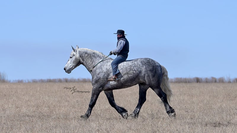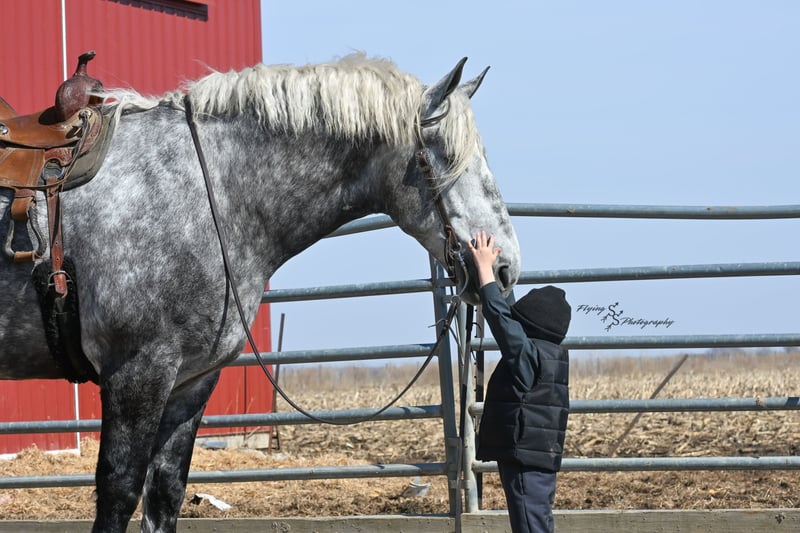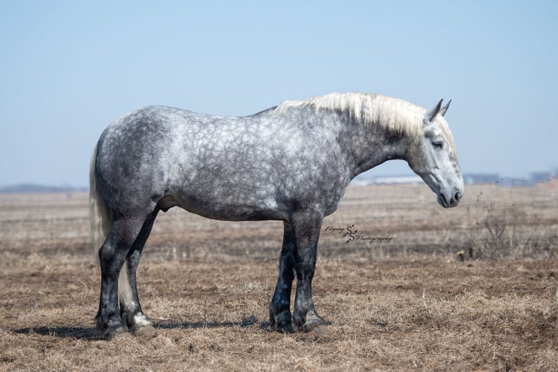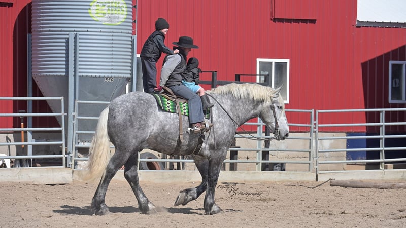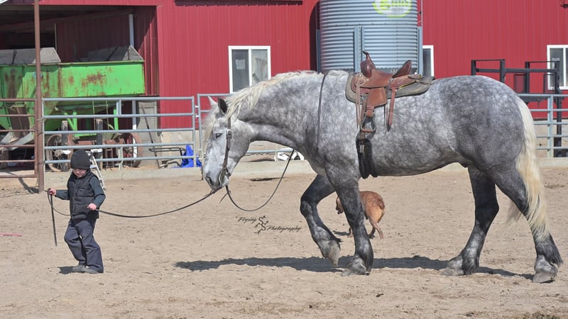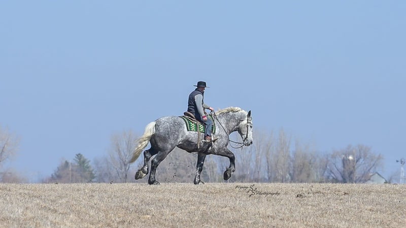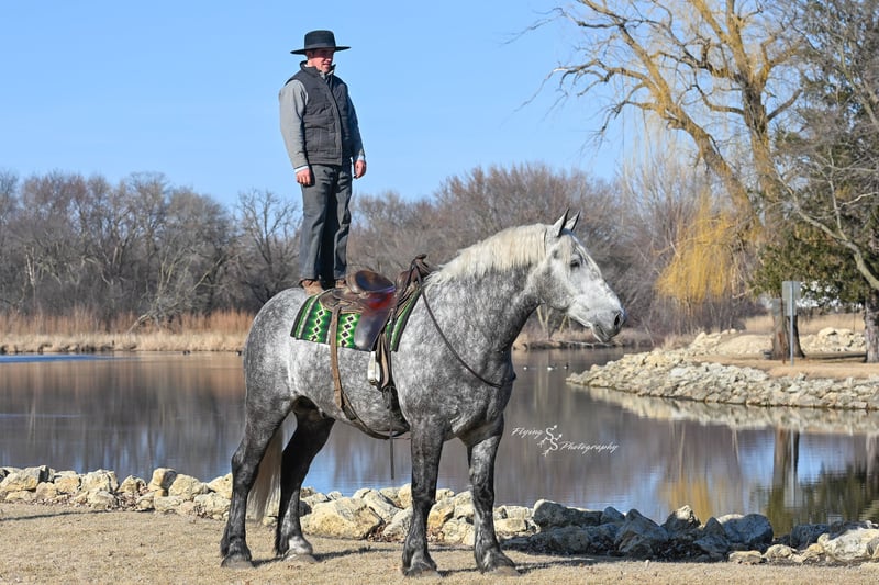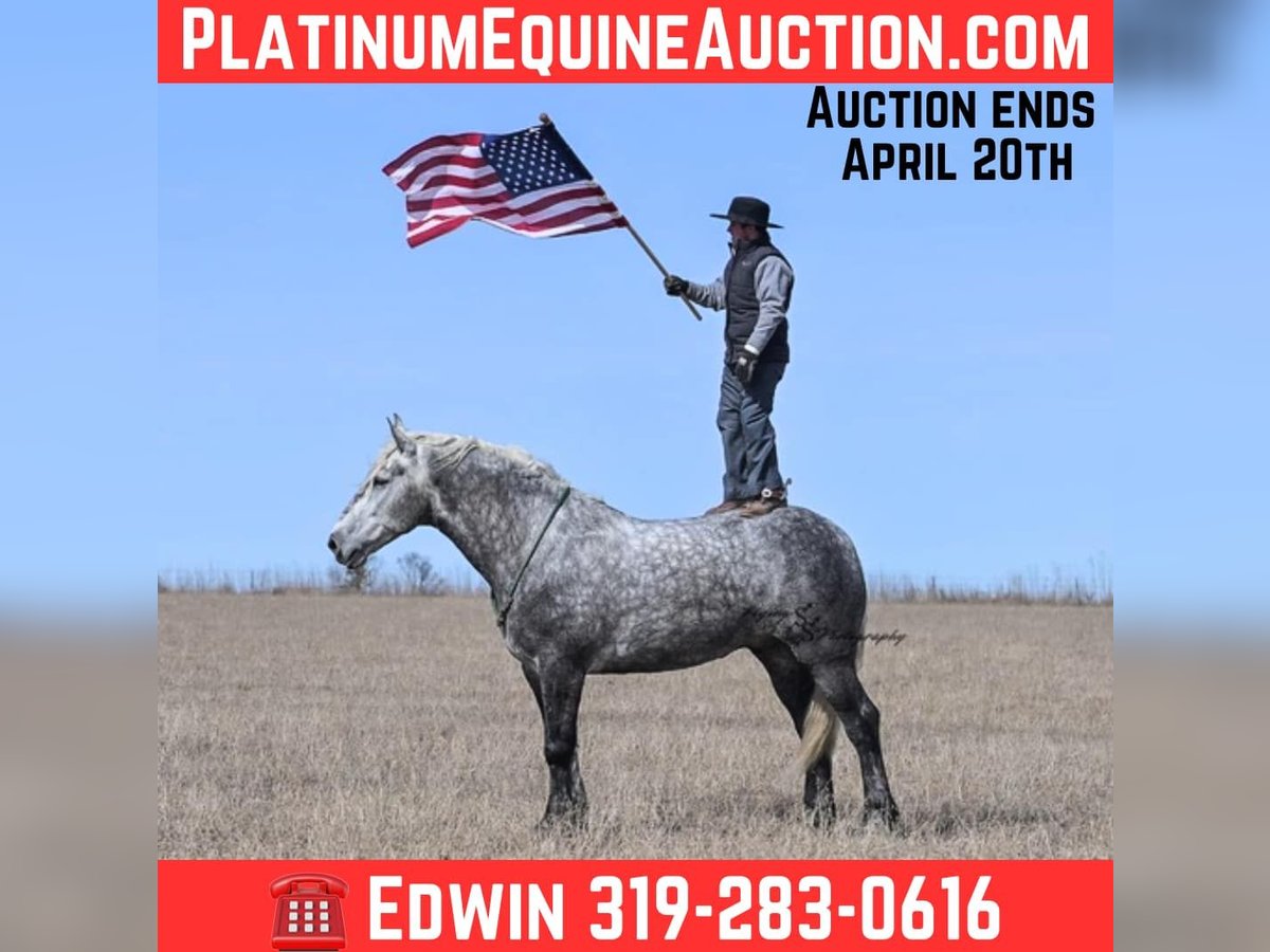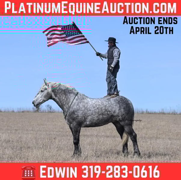 ONLINE AUCTION Place your bids at www.PlatinumEquineAuction.com Starting Bid $3500 Auction ends April 20th, 2025 Need a new saddle? Check out White Rock Saddles on our website or Facebook! Winston is a handsome dapple gray, 6 year old, registered percheron gelding. Our favorite thing about Winston is that he is incredibly safe. The phrase “Safety First” could quite literally be used as his slogan. Winston is a gentle giant, standing a staggering 18.1h tall! He will happily stand at a mounting block, or let you mount from a fence. Do not let Winson’s size intimidate you, he is a joy to handle, even for children! He is a blast to take out on the trails, easily stepping over down timber, crossing water, and going whatever direction you point him in. Winston is perfect for riders of any age and any level of experience. He is very honest on the ground as well as under saddle, admirably taking care of his rider, allowing you to place all of your trust in him. Winston rides western and bareback, bridled and bridleless, and is as comfortable under harness as he is under saddle. He drives absolute best and is incredibly safe, even for beginners or kids. Winston is easy to catch, saddle, bridle, bathe, shoe (easily picks up all 4 feet), and groom. He does great in a stall, as well as in a pasture with other horses. He rides around in an open field just as honest as he does in an arena. He is absolutely traffic safe, and is unphased by anything you will see riding down main street or a highway on a busy evening. Winston will lope in the correct lead, has a nice stop, stands quietly when cracking a bull whip or shooting a pistol, will walk through all of the obstacles, and stays solid even with time off. He is a great fit for the whole family. Winston is even loved by the farm dogs, who he will also allow to ride him! It is impossible to list everything we love about this gentle giant because the list is endless. He is truly a once in a lifetime gelding that we are proud to offer! Winston is current on Coggins, and also has a PPE on file. If you have any questions, or would like to meet him prior to the auction ending, please call Edwin Raber at 319-283-0616. Located in Fairbank, Iowa ONLINE AUCTION Place your bids at www.PlatinumEquineAuction.com Starting Bid $3500 Auction ends April 20th, 2025 Need a new saddle? Check out White Rock Saddles on our website or Facebook!