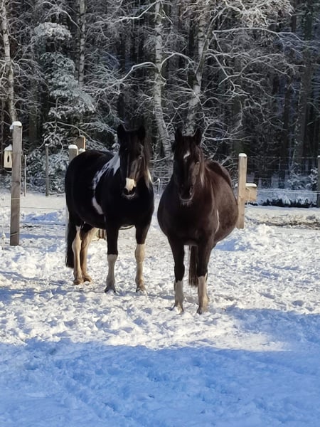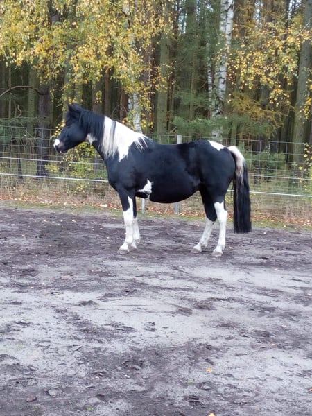 Unsere Pinto Stute sucht ein neues, liebevolles Zuhause. Hat ein Stockmaß von 1,54m. Wir haben Sie im Alter von 5 Jahren aus nicht optimaler Haltung übernommen. In den letzten Jahren haben wir viel Zeit und Herzblut investiert, um sie sowohl körperlich wieder aufzubauen als auch den Umgang mit dem Menschen zu festigen. Sie wurde von uns sozialisiert, aufgepäppelt und behutsam angefangen sie ausgebilden. Sie steht in unserem Offenstall mit zwei Wallachen zusammen, kennt es aber auch in der Box zu stehen. Sie ist sehr Menschenbezogen geworden und möchte immer dabei sein. Sie braucht volle Aufmerksamkeit, sonst fordert sie diese auch ein. Bodenarbeit macht ihr sehr viel Spaß, sie läuft auch frei hinter einem her. Lässt sich um die Vorhand, Hinterhand und seitwärts verschieben. Kann sich um sich selbst drehen. Hat keine Angst vor Planen, Fahnen, Hüpfetieren, Seifenblasen, Feuer, Motorsägen, etc. Lässt sich vom Boden in allen drei Grundgangarten longieren mit und ohne Sattel. Sie wurde im Schritt und Trab geritten auf dem Platz. Im Gelände war sie bisher nur zu zweit unterwegs. Sie wurde bei uns nur gebisslos gearbeitet. Sie steht jedoch noch nicht am Ende ihrer Ausbildung und ist daher kein Kinder oder Anfängerpony. Sie braucht eine feste Person mit etwas Erfahrung, die ihr Sicherheit gibt und sich auch durchsetzen kann. Charakterlich ist Sie eine sehr unerschrockene und coole Stute. Sie zeigt keine Ängste bei Trecker, Autos, LKWs, Fahrrädern, Motorrädern oder anderen unheimlichen Dingen. Im Umgang ist sie unkompliziert: Tierarzt – brav Hufschmied – problemlos Anhänger fahren – kennt sie und macht sie gut Aufgrund veränderter persönlicher Lebensumstände können wir ihr leider nicht mehr die Arbeit und Förderung bieten, die sie verdient. Sie wurde die letzte 1,5 Jahr nicht mehr aktiv gearbeitet. Daher haben wir uns schweren Herzens entschieden, für sie ein neues Zuhause zu finden. Wichtig: Sie wird nicht aus Zeitdruck verkauft. Für uns steht an erster Stelle, dass sie ein wirklich passendes und liebevolles Zuhause bekommt, in dem sie gefördert wird und ihr Potenzial entfalten kann. Bei ernsthaftem Interesse freuen wir uns über eine Nachricht. In einem Telefonat erzählen wir gerne mehr über Sie.