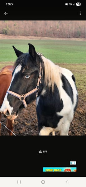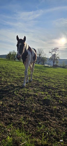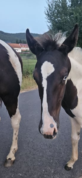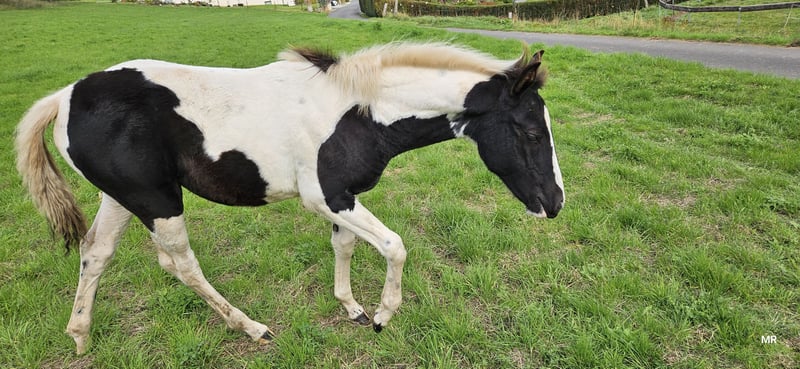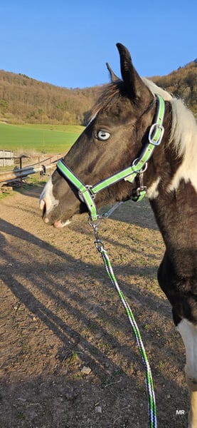 Wir geben leider aus persönlichen Gründen unsere tolle jährlingsstute ab . Name : Harley Mirage Geb: 02.05.24 Endmaß: ca 155 cm Rasse: Paint x Pinto Harley ist eine ganz tolle und lernbereite Stute . Sie kennt das fohlen ABC . War regelmäßig beim schmied sehr vorbildlich. Sie kennt es spazieren zu gehen und geht auch von der Herde weg. Ist E Zaun sicher . Tierarzt auch absolut kein Problem. Ist geimpft und gechipt , hat einen grünen Pass. Sie steht noch 24/7 draußen mit ihren Geschwistern und 2 Wallachen. Neue Pferde in der Herde sind für sie absolut kein Problem. Im Winter steht sie dann auch in der Box. Sie lässt sich überall anfassen und putzen . Wurde im Sommer auch mal abgeduscht. Sie ist sehr robust und war auch noch nie krank . Sie ist immer artgerecht im Herdenverband aufgewachsen und lebt dort weiterhin. Ihre Geschwister und Eltern stehen mit vor Ort . Harley hat ein blaues Auge was absolut schick ist . Sie hat eine tolle scheckung und einen noch viel liebevolleren Charakter. Harley kennt sämtliche bauernhoftiere ( rinder , Hühner, Schafen, Hunde, Esel usw ...) kennt es auch von Kindern gekuschelt zu werden . Sie ist stets lieb und geht mit Vertrauen der Welt entgegen . Hat noch nichts schlechtes erlebt . Kennt Straßenverkehr. War als fohlen öfter mit beim ausreiten bei Fuß dabei. Ihr Papa ist Tash King Jack ein 6 Panel n/n getesteter Paint Horse Hengst. Ihre Mutter ist eine hübsche pintostute . Harley selbst ist ein rappschecke .