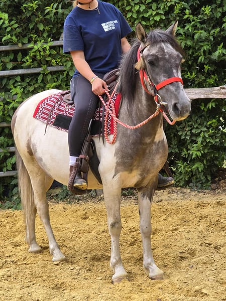 Pintopony MELINA Height: approx. 1.36 m E-pass, microchipped, and veterinary examined Price: €4300 Pre-purchase examination available She is: – well-behaved in handling and riding – friendly & people-oriented – eager to learn and reliable – in a rare & striking color – perfectly suited for leisure & trail riding Perfect for: Riders with some experience who want to further develop a young, solid mare Our horses: – regularly dewormed – cared for by a farrier & osteopath Farm shop: Western saddles, bridles, accessories Transport & accessories organized at a low cost upon request Our service: ✅ 3 months exchange right ✅ Test ride: €35, each additional horse €25 (deducted from purchase on the same day) ✅ €100 instant discount for pickup/transport on the same day ✅ Personal & honest advice Inquiries please only by phone: 0171 – 4001968 Available daily from 8 AM to 8 PM ⚠️ No email or WhatsApp ⚠️ All information without guarantee