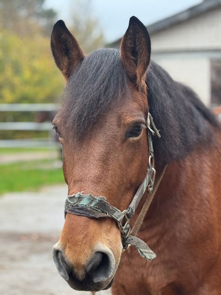 Britta ist eine 12-jährige, 1,60 m große, braune, polnische Warmblutstute. Sie ist im täglichen Umgang zuverlässig und unter dem Sattel sehr brav. In der Dressur ist sie solide ausgebildet, leicht zu reiten, sitzbequem und eher ruhig unterwegs, sodass sie sich gut für Anfänger oder entspannte Freizeitreiter eignet. Einige Sprünge meistert sie problemlos, und im Gelände zeigt sie sich sicher und unerschrocken. Aufgrund vermutlich negativer Erfahrungen in der Vergangenheit kann Britta in bestimmten Situationen eine abwehrende Art zeigen. Daher ist sie nicht für den Schulbetrieb geeignet, obwohl sie beim Reiten grundsätzlich kooperativ und verlässlich ist. Für sie wünschen wir uns eine feste Bezugsperson, die konsequent, verlässlich und zugleich ruhig mit ihr umgeht und ihr klare Strukturen bietet. In der Herde ist sie verträglich und an verschiedene Haltungsformen gewöhnt. Insgesamt suchen wir für Britta einen passenden Menschen, bei dem sie sich langfristig wohlfühlen kann.