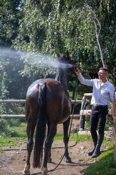Eine Stute, die auf ausgedehnten Weiden, Hügeln und Hügeln in einer Herde mit mehreren Altersklassen aufwächst. Eine solche Aufzucht garantiert schöne, gesunde Hufe, starke Sprunggelenke, Gelenke und eine leistungsfähige Lunge. Die Stute ist neugierig, mutig, ohne Probleme mit Bädern, Fellen, Halfterwechsel. Regelmäßig entwurmt, Ergänzung mit Vitaminen, Probiotika. Zähne und Gebiss werden ab dem 18. Lebensjahr gepflegt. Starke mentale und physische Struktur des Pferdes. Gute Futterverwertung, problemlos im Transport. Geritten im Alter von 5 Jahren, ausgiebig auf dem Dressurviereck und im Gelände gearbeitet. Seit 3 Monaten im regelmäßigen Training. Die ganze Zeit über wird er von Adam Susłowski geritten. In seinem Stammbaum befindet sich das berühmte Springpferd Roland aus der Linie von Ramiro Z, mütterlicherseits Le Duc und Lord Alexander und die Legende der malopolnischen Pferde - Emetyt. Tuv getan vor 2 Jahren ohne Beschwerden.