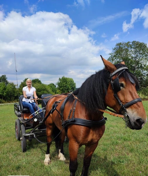 I am selling my 8-year-old Polish cold-blood mare, a sporty type. She is driven single harness by me but has also competed in pairs at the breeding farm. She is reliable and confident in front of the carriage. I also harness her alone and go on solo drives. Under saddle, she displays her sporty nature and enjoys small dressage exercises. She is comfortable riding alone or in a group, both in the terrain and on the riding arena. Groundwork and lunging are also part of her training. She is fully shod, loads effortlessly by herself, and is very well-behaved during trailer transport. She is steady-nerved, no spook, and moves with beautiful, willing gaits. She is accustomed to orientation rides and unfamiliar environments such as indoor arenas and riding fields. Jaschka has a typical, somewhat stubborn cold-blooded personality and often tests her handler. A confident and consistent handling approach is very important for her. She is used to open stables and paddock life, and gets along well with mares and geldings. Her teeth were checked in April, and her tetanus vaccination is up to date. If you are looking for a lively partner for driving and riding, she is a fantastic companion with her colleague by her side. Equipment such as carriage, saddle, bridle, harness, etc., can be purchased together.