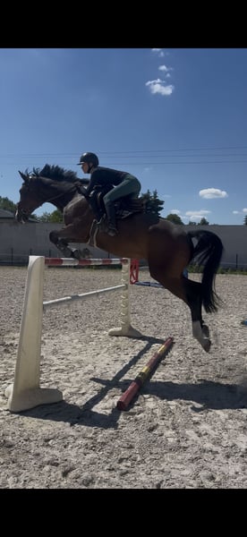 Die Stute ist 13 Jahre alt und hat mich von Turnieren im Bereich von 120 bis 140 cm eingeführt. Sie ist sehr ausgeglichen, angenehm im Umgang und leicht zu reiten. Zudem ist sie sehr gut ausgebildet in der Zäumung, macht seitwärts Bewegungen sowie erste Piaffe-Übungen problemlos. Sie ist nicht schreckhaft und hat keinerlei Probleme, in den Pferdeanhänger zu gehen.
