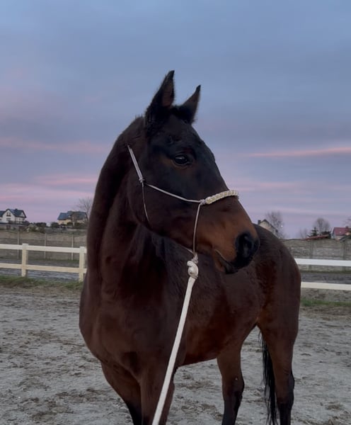For sale is an exceptional mare, born in 2010, approximately 16.1 hh, with a Hakim conformation. She was born and raised in Rzeczna, where she spent most of her life as a broodmare. She has competed at championships, passed a aptitude test at age five, and completed a training internship. I was informed that her offspring compete in show jumping up to 130 cm. This mare has Oldenburg bloodlines, with some Thoroughbred infusion from her dam, but she has inherited only the best qualities: lightness, elasticity, a willing heart for work, combined with gentle handling. Her build is very correct: strong, healthy legs, a well-formed croup, a graceful neck even without intensive work, a spacious gallop, and a relaxed, free-flowing trot. Her appearance is almost baroque—she is extremely charming and noble. She is very versatile on the ground, knows rein-back, lateral movements, and works on a lunge line almost independently. She can go on the most delicate aids, without a bit, and often self-sets herself up. She is not a horse you need to wrestle with; in fact, the gentler the handler, the more enjoyable working with her becomes. Her character is truly exceptional: calm, communicative, affectionate, and very human-oriented. During work, she “asks questions,” responding to body language and intention. Raised on pastures in a herd, she loves free movement and social contact with other horses, naturally releasing tension through yawning and relaxation. She will thrive in a large herd, on pasture, or as a companion in a private stable. She is very intelligent, will not allow herself to be dominated, and will avoid problems. It is important to me that she is treated as a partner in her new home, with respect for her nature. If she is confined or not given enough attention, she may withdraw and become nervous; but to someone who provides her with space and calmness, she will give her whole heart. As a proven mother, she is independent, with healthy, strong, and noble foals. Her health is excellent; she does not lameness, and at the end of December, extensive blood tests were performed, with supplementation introduced. Her teeth are done, vaccinations started, and her hooves are in the process of correction (to be trimmed). She has been checked by a physiotherapist; she is relaxed and has no contraindications. She does not require expensive or specialized feed. No signs of nutritional deficiencies, very well-behaved, and calmly “savors” her food. She eats hay from a net, consumes grass pellets, and urinates in one spot in her stall, remaining clean. This mare is ideal for breeding, but also as a family horse, for groundwork, respectful riding, or even shared development in dressage, western riding, or agility. She has jumping bloodlines, although she has not jumped with me. She is a horse with a big heart and enormous potential with daily, attentive human contact. Completely safe, but I emphasize she is a broodmare in condition. Despite her appearance, she is an experienced mother, remembers a lot, but still needs consistent, gentle training like any young horse. Since December, she has been working on the ground, strengthening her back, revisiting gymnastics without stress or rush, which she loves and tries very hard to do. She is the dream horse for any woman who values relaxation alongside horses, enjoys scenic rides, or is looking for a proven mother. I would love to give her a lifelong home, but my life situation has changed. It would be wonderful to find her a home near Tricity so I can visit her occasionally. The horse is located near Pruszcz Gdański, and transportation can be arranged. More information via private message. Please also watch the videos showing her work and character, linked below. At the end, there are photos of her foals from championships. Best contact via SMS at 785970082.