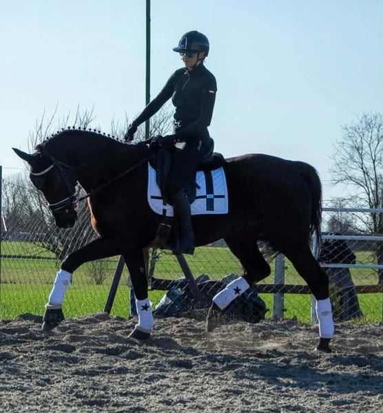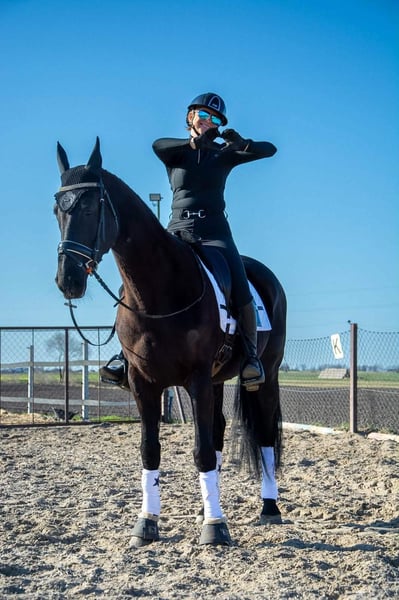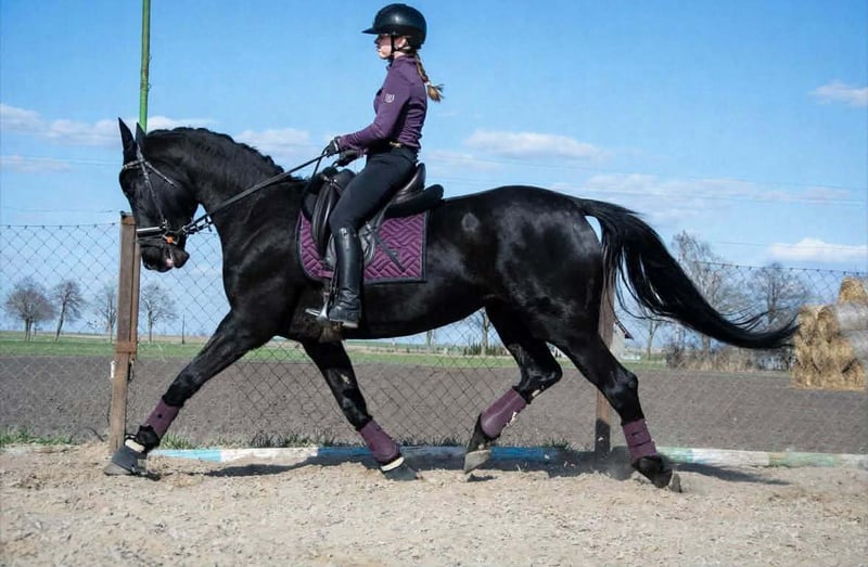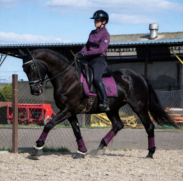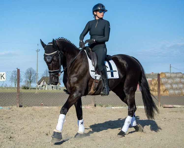 6Y black mare, 168 cm tall. This mare has experience in carriage driving, has participated in competitions, and has been seen at city festivals. She is very pleasant to ride, cooperative, and willing to work. She is safe and well-behaved in the saddle, even for small children, and is therefore suitable for an amateur rider. She is easy to handle, does not kick or bite, and is good with children. She is gentle with people and other animals and behaves very well in a herd. She can be easily transported in a trailer. She gave birth to a black foal with four white socks The mare has a valid veterinary inspection (TÜV) from February 2026.