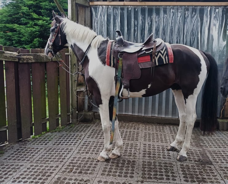 Dyngus (Pablo) - ein 2019 geborener polnischer Sportpferdewallach in der auffälligen und sehr schönen Farbe Rappschecke. Mit einem Stockmaß von etwa 1,70m sowie großrahmigen, harmonischen Gebäude deckt er auch große Reiter gut ab. Er verfügt über eine vollständige Abstammung, ist gesund, PSSM1 n/n getestet und seine kleine Ankaufsuntersuchung vom Juni 2024 war ohne Befund. Aktuell ist er vierfach beschlagen, kann jedoch problemlos auch barhuf gehalten werden. Im täglichen Umgang zeigt sich Dyngus als außergewöhnlich lieber, freundlicher und menschenbezogener Wallach. Er ist ausgeglichen, neugierig, verschmust und lernt sehr schnell. Er verzeiht Reitfehler, lässt sich fein reiten und wird derzeit auch von einer Jugendlichen problemlos geritten. Dyngus ist zudem absolut unkompliziert: Er ist schmiede- und verladefromm sowie brav beim Tierarzt und Hufschmied. In der Herde ist er rangmittig und verträglich mit sowohl Stuten als auch Wallachen. Er lebt im Offenstall bzw. Laufstall und eine artgerechte Haltung mit viel Auslauf und Sozialkontakt wird für ihn weiterhin gewünscht. Unter dem Sattel besitzt er eine solide Grundausbildung. Er geht sicher in allen drei Grundgangarten sowie an der Hand und im Schritt Schenkenweichen / Seitengängen Vorder-/Hinterhandwendung, Rückwärtsrichten etc .Dyngus wird weiterhin gefördert, kennt einige Trail und Working Eqiutation Hindernisse(Brücke, Glockengasse,Tor, Stangenlabyrinth etc) .Er wird Englisch geritten, kennt aber auch den Westernsattel. Er verfügt über viel Geländeerfahrung ( auch in schwierigen + bergigem Gelände). Auch allein ist er souverän unterwegs. Zusätzlich hat er eine zweispännige Fahrausbildung erhalten. Es stellte sich heraus das Kutschefahren nicht seins ist und ihm Stress verursacht. Dies ist auch der EINZIGE Verkaufsgrund, da für die Besitzer aufgrund der eigenen Gesundheit Kutschefahren dem Reiten vorgeht. Ansonsten ist er ein vielseitig einsetzbares, talentiertes Pferd, das bereits an verschiedenen Kursen wie Dressur, Trail oder Working Equitation teilgenommen hat und mit Freude ins Wasser geht. Dyngus ist ein rundum tolles Pferd mit bestem Charakter, schöner Optik und gutem Ausbildungsstand - ein echter Herzenspartner für Menschen, die ein zuverlässiges, lernfreudiges und unkompliziertes Pferd suchen. Weitere Videos können auf Anfrage gerne zur Verfügung gestellt werden.