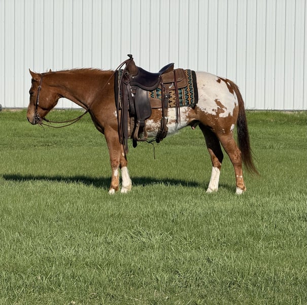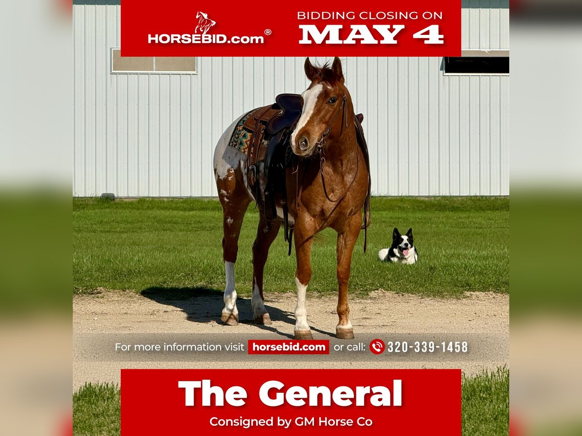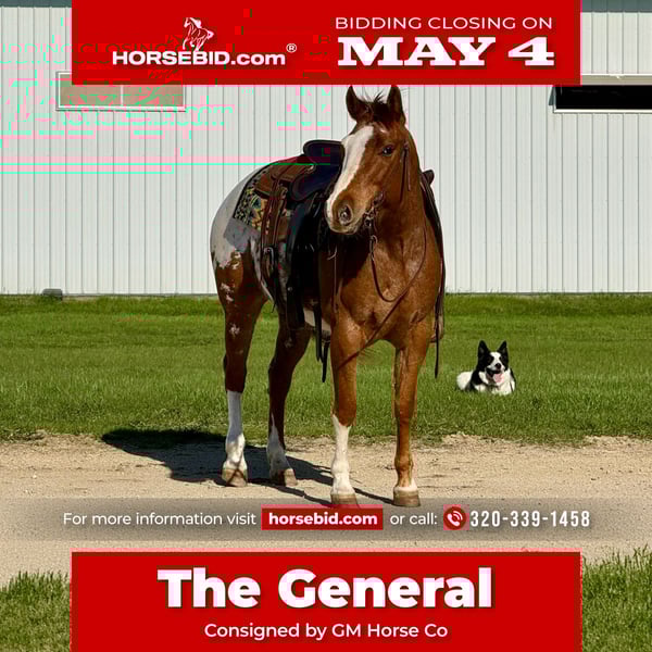 ▪️▫️◾️𝐭𝐡𝐞 𝑴𝒂𝒚 𝐒𝐞𝐥𝐞𝐜𝐭◾️▫️▪️ Happening now thru MONDAY | MAY 4th - Available EXCLUSIVELY on HorseBid's website! For more details and to register visit: www.Horsebid.com CONSIGNOR CONTACT: GM Horse Co 320-339-1458 LOCATION: Cannon Falls, MN BREED: POAC REGISTERED: Yes REGISTERED NAME: Ima Coosanova Admiral COLOR: Sorrel Snowcap Blanket HEIGHT: 14 AGE: 10 GENDER: Gelding General is a 10-year-old registered POAC Appaloosa gelding standing 14 hh. If you’re looking for a pony the whole family can enjoy, General checks every box. He’s the kind everyone wants—safe, gentle, and dependable. General is great on the trails, solid in the arena, easy to catch, and a pleasure to be around. With his eye-catching Appaloosa color and chrome, he’s sure to turn heads wherever you take him. General has excellent manners both on the ground and under saddle. He’s safe around kids, dogs, and all types of livestock. He stands quietly for grooming, bathing, and the farrier. In the arena, General has a nice slow walk, smooth trot, and an easy, cute lope. He picks up both leads, neck reins well, spins both directions, is soft in the bridle, and has a solid stop. He’s also been exposed to plenty of fun—he’s comfortable with a rope, has been used on the dummy, and doesn’t mind activity around him. Out on the trail is where General really shines. He’s been on overnight camping trips, ties well on a high line, and hauls great. He’s a “more whoa than go” type, making him a confidence builder for riders of all levels. He’ll cross anything you point him at—water, downfall, steep terrain, railroad tracks—you name it. Traffic safe and accustomed to heavy machinery, nothing seems to bother this gelding. Ride him day or night with confidence. If you’re searching for a reliable, family-friendly horse to enjoy all summer long, General is the one. Up to date on all vet and farrier care. Location - Cannon Falls, Mn Gabriel Murphy 320-339-1458