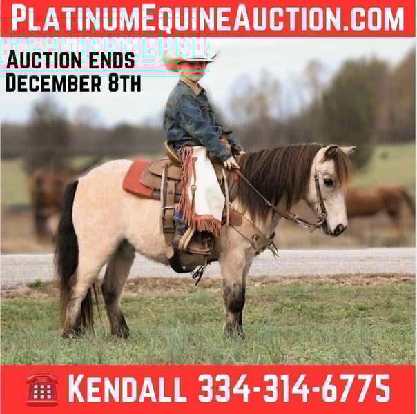 ONLINE AUCTION Place your bids at www.PlatinumEquineAuction.com Starting Bid $3500 Auction ends December 8th, 2024 Need a new saddle? Check out White Rock Saddles on our website or Facebook! Goody fits his name very well, he is a goody! Stands 41 inches tall (10.1HH) and only 7 years old. Super flashy buckskin gelding! He’s been incredible to watch and is one of the best ponies we’ve ever trained! My twin boys taught this little guy to be all that he is. My boys aren’t quite strong enough to saddle him on their own but he’s stands there patiently while they attempt to throw it on his back many times lol. They can catch, groom, pick his feet, and load him on the trailer by themselves and unload. We have hauled him to the rodeos/barrel races and spent many of days and nights at the roping pen. He rides out like a solid finished horse with all the buttons. Goody is very easy to navigate for little weak arms to go and stop as they please. Wherever you point Goody he will go. He has been rode in 200 acres of open cotton fields with the wind blowing about 20 mph and he acts like an old rope horse head down and goes where his jockey points him. He’s safe has never bucked or acted foolish even in the most sticky situations my little boys have put him in. He’s been around cattle, dogs, pigs, ATVs, tractors ect. Nothing phases him. If you want your kids to have a safe legit pony that will walk, trot , and lope correctly and do it in a willing way, Goody is your guy. He has new coggins and health certificate. He is sound and requires zero maintenance. We are excited to offer this exceptional pony to you just in time for Christmas. Please reach out with any questions to Kendall Robertson 334-314-6775 about Goody. I’d love to talk to you about him. We are located in Huntland TN. ONLINE AUCTION Place your bids at www.PlatinumEquineAuction.com Starting Bid $3500 Auction ends December 8th, 2024 Need a new saddle? Check out White Rock Saddles on our website or Facebook!