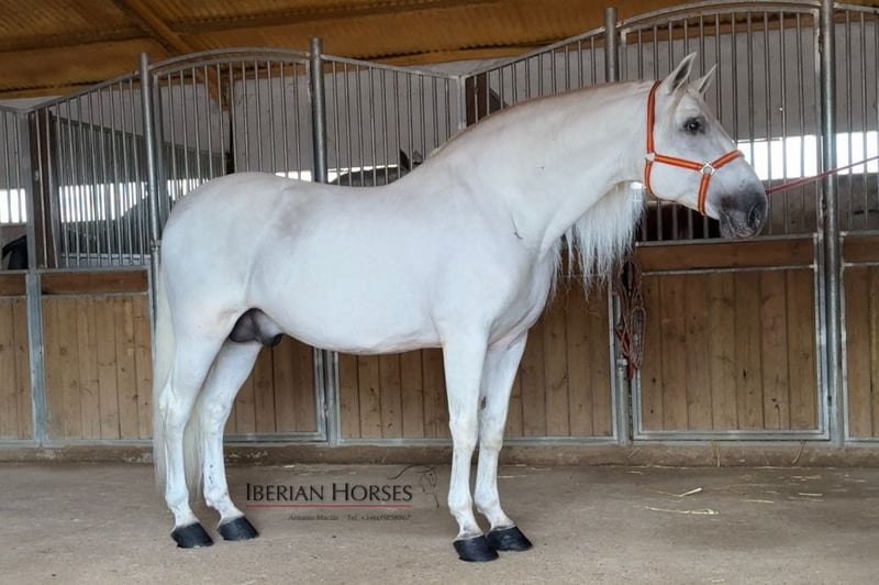 Wir präsentieren einen außergewöhnlichen Pura Raza Española (PRE), geboren im Jahr 2016, mit einer beeindruckenden Widerristhöhe von 171 cm, der die wahre Essenz und Majestät dieser Rasse verkörpert. Dieser Hengst vereint eine kraftvolle, ausgewogene Morphologie mit einer natürlichen Eleganz, die alle Blicke auf sich zieht. Unter dem Sattel arbeitet er derzeit auf Dressurniveau 2–3 und zeigt eine solide Basis sowie stetige Fortschritte. Er zeichnet sich durch seine Noblesse, Arbeitsbereitschaft und große Sensibilität für die Hilfen aus, was ihn sowohl für ambitionierte Freizeitreiter als auch für Profis zu einem angenehmen und zuverlässigen Partner macht. Seine Bewegungen sind raumgreifend, ausdrucksstark und elastisch – besonders im Trab, wo er Takt und Rhythmus mit natürlicher Schwebe verbindet. Im Galopp zeigt er Balance und gute Versammlungsfähigkeit und vermittelt in jedem Sprung Kraft und Harmonie. Mit seinem ruhigen und verlässlichen Charakter zeigt dieser Hengst stets eine kooperative Haltung, ist leicht im Umgang und sicher in jeder Umgebung. Seine imposante Erscheinung, der gut angesetzte Hals und das klassische Profil machen ihn zu einem hervorragenden Vertreter der Rasse – ideal für Zucht und Wettkampf. Ein Pferd, das Schönheit, Adel und Funktionalität vereint – drei Eigenschaften, die den echten Pura Raza Española ausmachen.