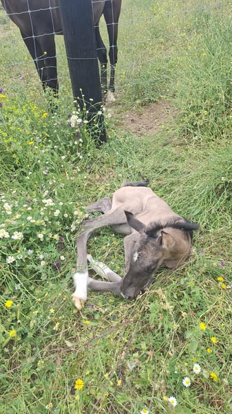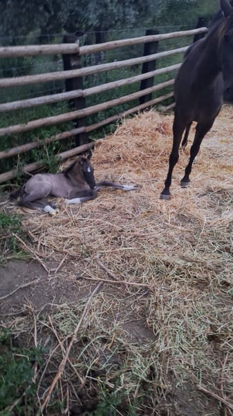 Our little Verdi is a true gem, featuring striking wild markings such as a dorsal stripe, a cross at the withers, and tiger stripes on the legs, all inherited from his nd1/nd1 genetics. His mother is a purebred Lusitano mare with a blue roan coat, smoky black, while his father is a very special PRE stallion with the SplashWhite gene 9. By combining these two baroque breeds, Verdi embodies the best qualities of both. As I only breed horses of high functionality, beauty, and size (mares starting at 1.65 m and stallions at 1.68 m), Verdi is expected to reach around 1.68 m as well. My breeding operation is based in Malaga, so Verdi can be visited there. Typically, my foals are weaned at 8 months of age.