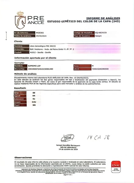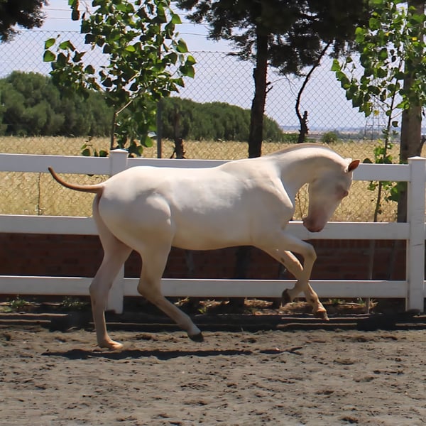 🏆 SUPREMO LOP – Exceptional Perlino PRE Colt of Great Breed and Quality Born on 12/05/2024, Supremo Lop is a Perlino Pure Spanish Horse (PRE) colt, featuring outstanding presence and excellent conformation, with an exceptional genetic makeup: ggAAEeCrCrNN. Very noble and refined, with a refined head, lively movement, expressive demeanor, and promising future. He comes from renowned bloodlines such as Ismaeli Más Más and Revoltoso by Paco Martín and Salvador Miras, ensuring nobility, strength, and beauty. 📍 Location: Madrid, Spain – Yeguada Los Pichus ✅ Piroplasmosis test: Clear 💬 Price upon request 📞 International contact: +34 625 657 373 🌍 Shipping available worldwide 🔥 A unique colt, with breed, color, and elegance. Perfect for those seeking a distinctive PRE with a signature look.