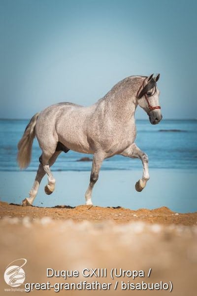 Lief karakter, ruw, staat buiten met zijn moeder, groot, goede bewegingen en afstamming. Afstamming: Terry, Yeguada Militar, Yeguada las Arenas, Francisco Olivera Bermudez. Heeft meerdere gekwalificeerde voorouders. www.elegante-andalusier.com