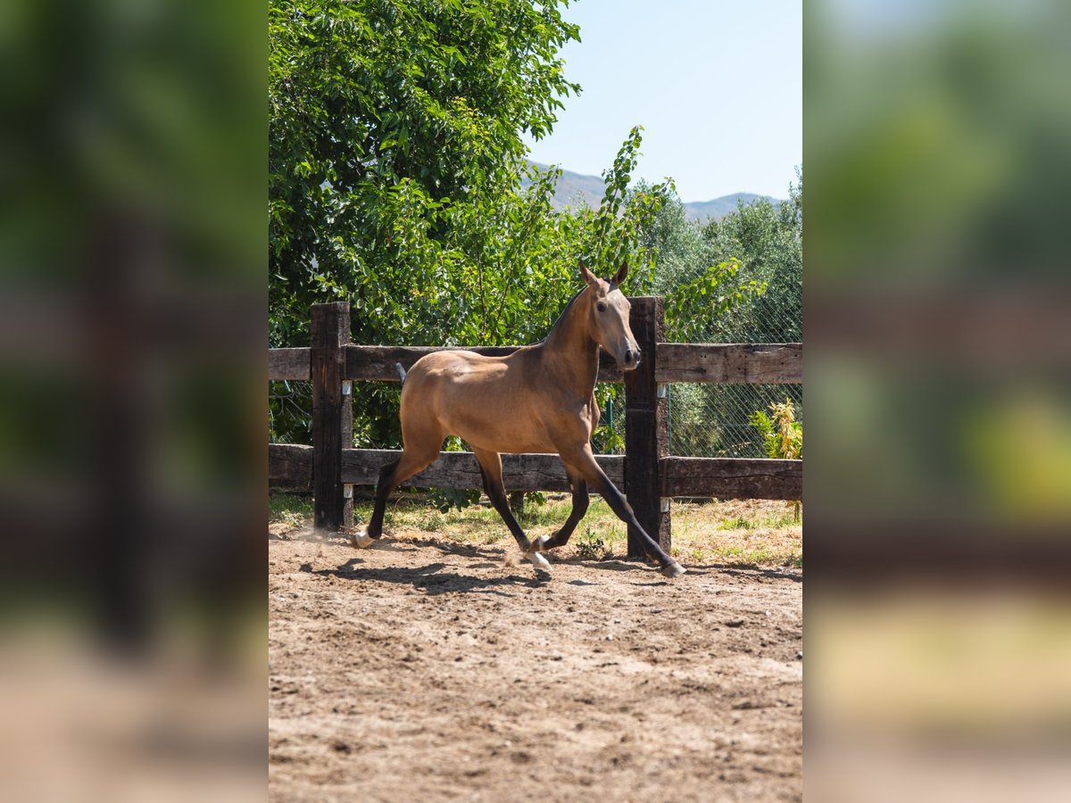 Junger PRE-Hengst, geboren im 03.2024. Buckskin-Fell und derzeit 165 cm im Widerrist. Ausgezeichnet im Kopf mit einem sehr süßen, ruhigen Charakter. Er ist an Kinder und Hunde gewöhnt.