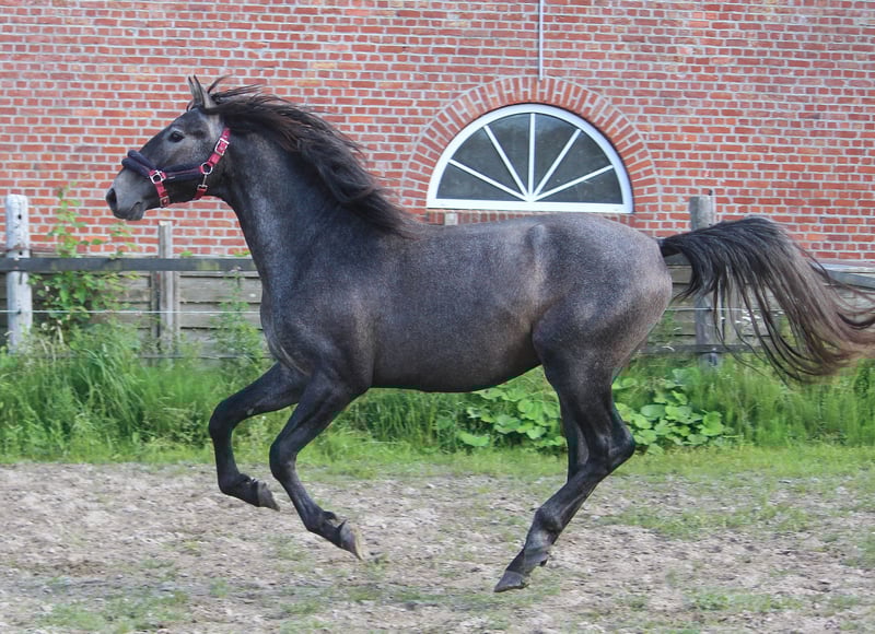 Garibaldi ist schon mit zwei Jahren ein absoluter Hingucker. Dieses Gesicht vergisst man nicht so leicht. Das große Auge, die leichte Rammsnase, der lange Hals mit feinem Genick - da passt einfach alles zusammen. Garibaldi kommt väterlicherseits aus einer sportgeprägten Linie und mütterlicherseits aus einer Linie der klassischen Arbeitspferde der spanischen Stierweiden. Ihm ist Bewegung in die Wiege gelegt, dabei Wendigkeit, Leichtfüßigkeit und Ausdauer. Mit seinem hervorragend im Rassetyp stehenden Gebäude ist der damit hoch interessant sowohl als Reitpferd, als auch für spätere Zuchtzwecke. Auch Zuchtschauen für spanische Pferde wären ein hervorragendes Parkett für ihn. Garibaldi hat gute bis sehr gute Grundgangarten. Im Norden Deutschlands geboren, ist Garibaldi an deutsche Weiden gewöhnt und 100% frei von Piroplasmose. Alle unsere Pferde gehen als Barhufer, das sollte also auch für diesen Junghengst kein Problem sein.