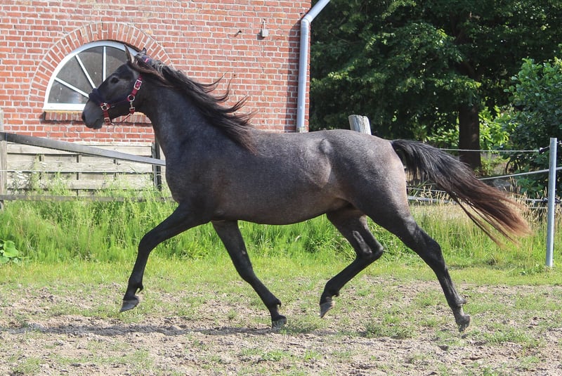 Garibaldi is already an absolute eye-catcher at the age of two. It's not easy to forget this face. The big eye, the slightly rammed nose, the long neck with a fine nape - everything just fits together. Garibaldi comes from a sporty line on his father's side and from a line of classic working horses from the Spanish bull pastures on his mother's side. He was born with movement, agility, light-footedness and endurance. With his excellent conformation in the breed type, he is therefore highly interesting both as a riding horse and for later breeding purposes. Breeding shows for Spanish horses would also be an excellent arena for him. Garibaldi has good to very good basic gaits. Born in the north of Germany, Garibaldi is used to German pastures and is 100% free of piroplasmosis. All our horses are barefoot, so this should not be a problem for this young stallion either.