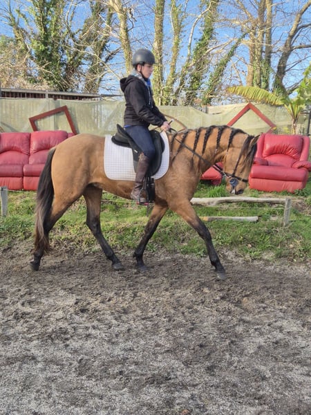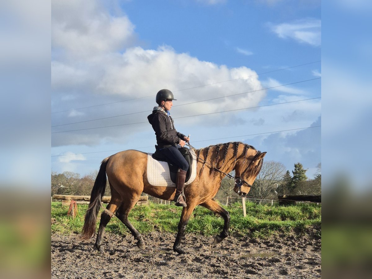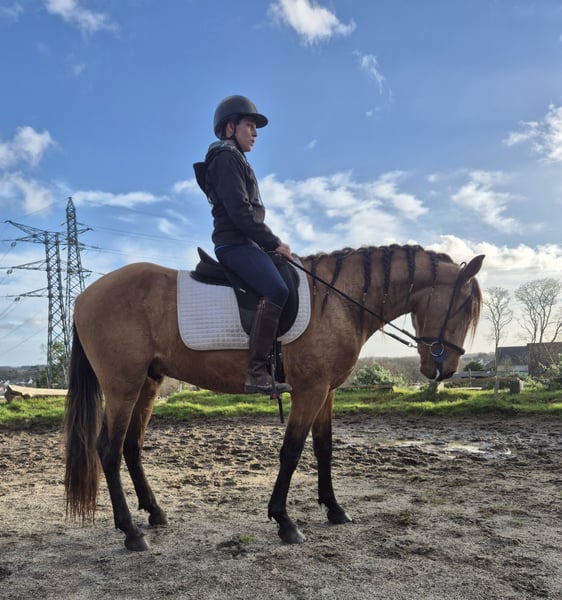 Ich verkaufe ZIMDOCTRO LOY alias Marcel Farbe: Isabell (golden / smoky, mit goldenen Mähnen an manchen Stellen, eventuell Gäne?) Er ist 3,5 Jahre alt und nimmt Anfang des Jahres noch 4-jährige Fohlen auf, aktuell misst er 155 cm und wirkt noch sehr jugendlich, aber bis zu seinem fünften Lebensjahr wird er zu einem beeindruckenden Pferd heranwachsen. Ich habe ihn mit 2 Jahren übernommen. Er wurde in der Bretagne geboren und lebte stets in einer Herde in freier Wildbahn. Er ist anfangs sehr sensibel, zeigt aber hinter einem sehr verspielten und neugierigen Wesen einen ausgeprägten Charakter. Beide Eltern sind rein PRE (Pura Raza Española), er ist im Royal Belgian Palomino Stud Book registriert und kann bei entsprechender Eignung auch als PRE-Hengst anerkannt werden. Er ist an Applaus gewöhnt, hat mehrere kommentierte Vorführungen vor Publikum absolviert, war bei verschiedenen Darbietungen dabei... Er ist bereits in die Manege eingetreten bei einigen Vorstellungen, die er im Freiarbeit vorbereitet hat. Im Sommer legte er etwa 40 km pro Woche zurück, unterwegs auf verschiedenen Untergründen: Gelände, Stadt, Wald, Strand, Autos, Traktoren, Busse... Er arbeitet an der Longe in allen drei Grundgangarten, mit Halfter oder gebisslos, auch mit Gebiss. Longenarbeit Einzelne Reiteinheiten im Sattel, Schritt und Trab in ruhigem Tempo. Er ist PRE, noch nicht vollständig ausgebildet, muss noch fein abgestimmt werden. Er lebt in Offenstall und Box. Sehr verspielt und kindlich im Umgang mit Artgenossen, der Unterwürfige im Herdenverband, der noch nicht weiß, dass er Hengst ist. Er wurde noch nie gedeckt. Das Pferd ist sensibel und eignet sich nicht für Anfänger. Eher für einen Profi, der Freude an Dressur, Voltigieren oder Freiheitsdressur hat. Er zeigt deutliche Tendenzen zur Freiarbeit. Videos und Fotos auf Anfrage. Region Bretagne / Süd-Finistère. Abschließend möchte ich sagen: Nein, ich verkaufe ihn nicht, weil er einen Fehler hat. Ich habe seit vielen Jahren eine verletzte Hand, die dringend wieder vollständig hergestellt werden muss. Das bedeutet mehrere Monate Pause und mehrere Operationen. Nur ernsthafte Interessenten, ich schätze diesen kleinen Kerl sehr. Er war mein Ideal, mein Spirit, und verdient ein 5-Sterne-Zuhause. Marcel wird für 6.500 € angeboten, Verhandlung möglich.