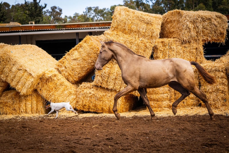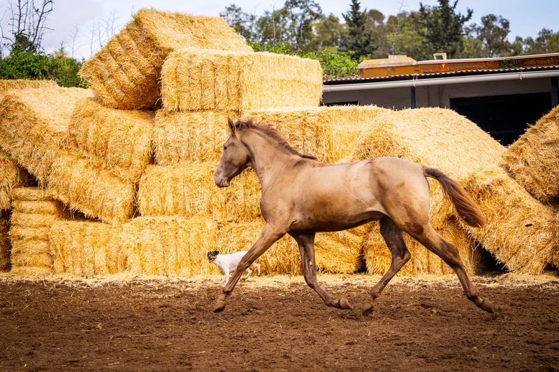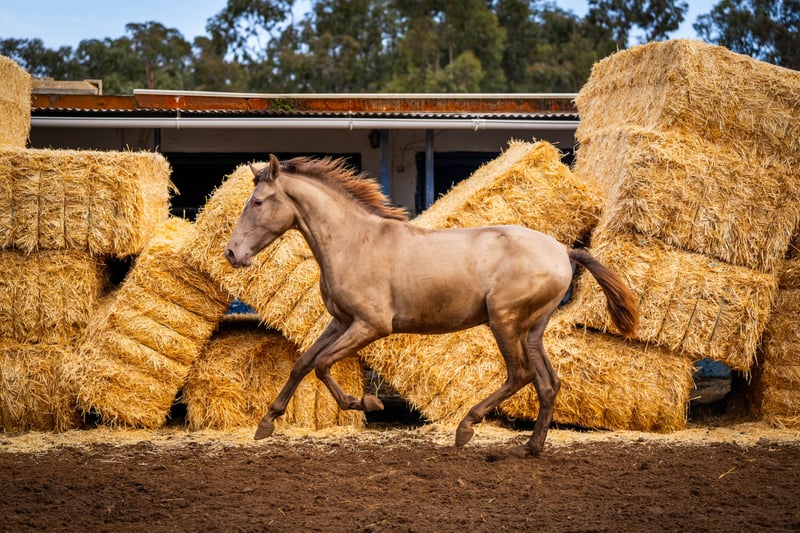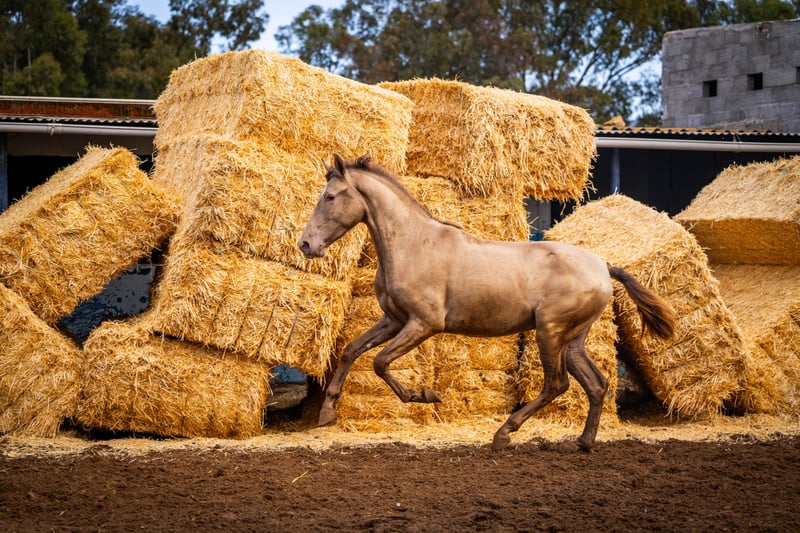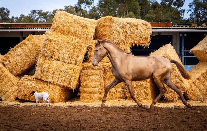 Młody koń: Kolejny szykowny szampański ogier z genetyką koloru: ggaaEEPRLPRL. Zawsze daje z siebie 100% genu Pearl. Jest bardzo dobrze zsocjalizowany i, jak widać na zdjęciach, bardzo zabawny. Jest nosicielem krwi Peralta, Yeguada Militar, Bohorquez i Torreluna / Więcej informacji na życzenie!