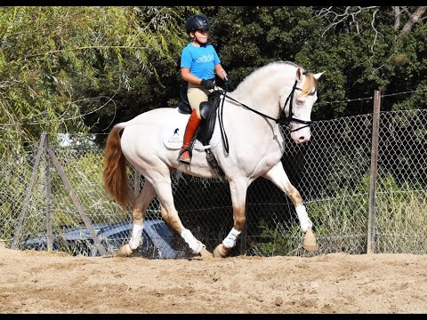 lieber Charakter mit angenehmen Temperament, neugierig, verschmust, in den Grundgangarten geritten, Seitengänge, Rückwärtsrichten, Spanischer Schritt, mit Piaffe und Passage angefangen, verbeugt sich, Gelände, groß, gute Bewegungen, spezielle Farbe, Bayo Perla (CrPrl) mit PRE Papieren, gekört, Piro negativ, für Kinder und schwache Reiter geeignet, Abstammung: Yeguada san Benito Abad, Paco Marti, Yeguada la Llana, Ururopa Gaucho III ist qualifiziert www.elegante-andalusier.com