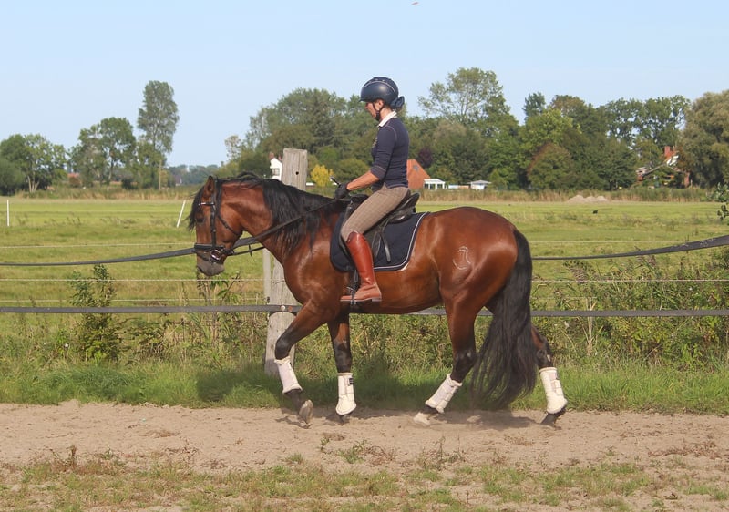 Feliciano Ducal ist ein absoluter Hingucker. Er hat einfach diesen besonderen Schmelz, den nur die iberischen Pferde haben. Er bewegt sich leichtfüßig, wendig und kraftvoll. Seine Grundgangarten sind überdurchschnittlich, der Schritt sehr gut. Feliciano hat alles, was auch ein gutes Dressurpferd ausmacht. Rahmen, Schick und Gang. Dabei hat er einen erstklassigen Charakter, ist immer freundlich und arbeitswillig. Er wird derzeit angeritten und zeigt auch schon unter dem Sattel, dass er mal ein ganz Großer werden will. Feliciano ist über spanisches Leistungsblut gezogen, in seiner Ahnentafel finden sich ausschließlich Pferde namenhafter Gestüte. Er ist daher auch als späterer Deckhengst ausgesprochen interessant.