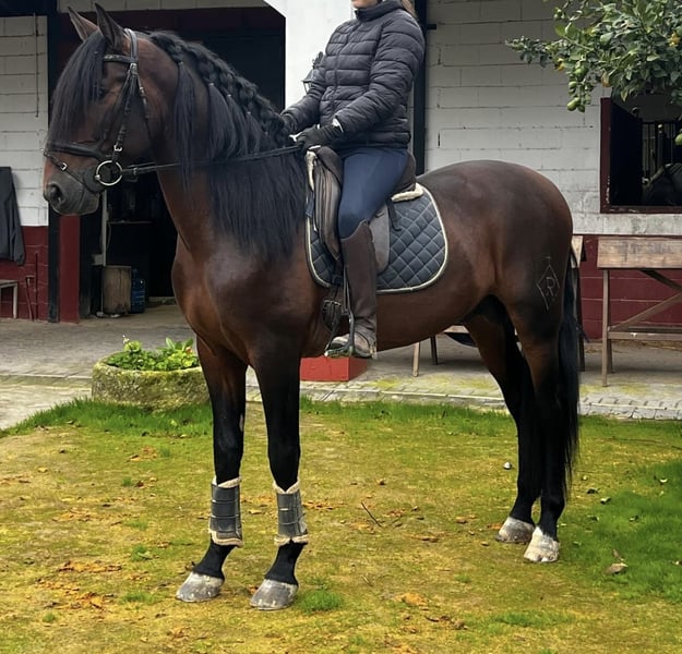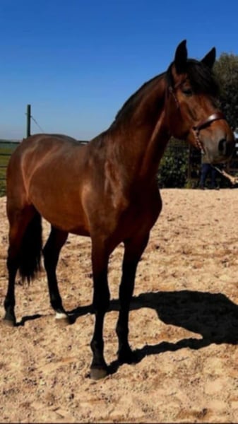 He is a (soon-to-be) 5-year-old bay PRE stallion with classic type and an expressive presence. He stands out for his harmonious conformation, good proportions, and the typical nobility of the Pura Raza Española. The stallion is backed and under saddle, showing himself to be calm, cooperative, and people-oriented. He works willingly, is pleasant to handle, and has a well-balanced temperament. In daily handling, he is uncomplicated and friendly. He is ideally suited for riders looking for an honest, quiet PRE — whether for further dressage training or for leisure riding. A charming young stallion, who impresses both with his character and his appearance. Directly from his breeder. Mother can be visited as well and half brother is located in Switzerland. 📍 Location: Spain 📞 Further information gladly upon personal inquiry (English, German or Spanish).