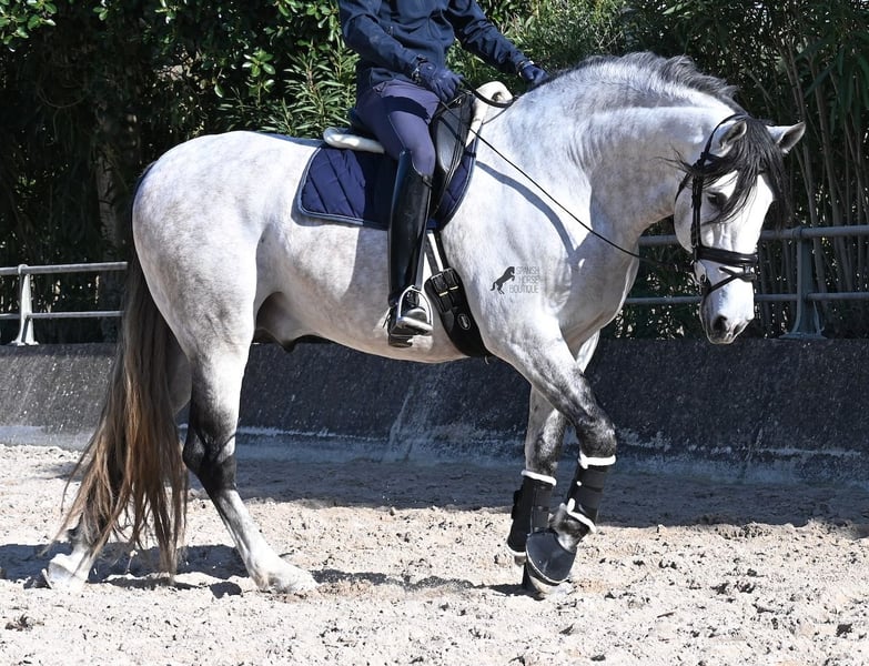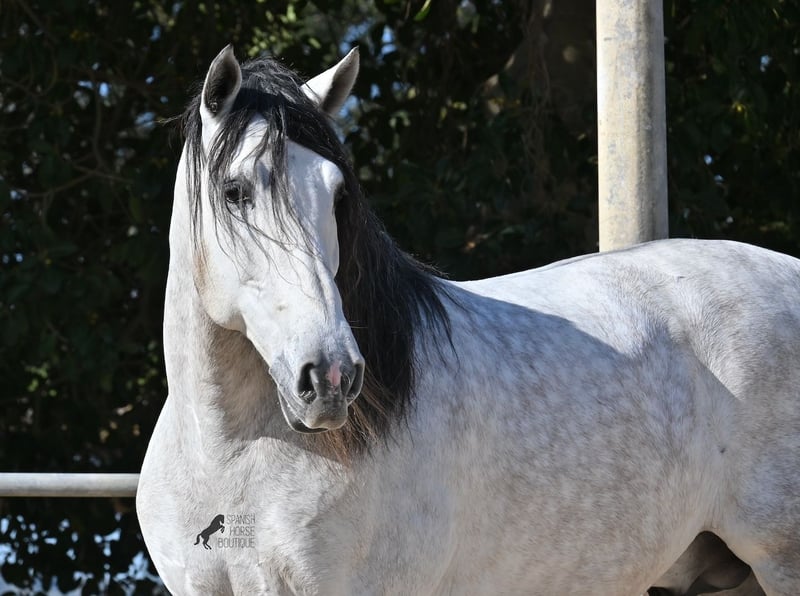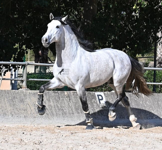 This 2021-born purebred PRE stallion (Andalusian with registration papers from ANCCE) is so stunning and majestic that his appearance takes your breath away. Baroque, expressive, with a refined head and gentle eye, he exhibits magnificent movement while remaining gentle. He embodies the ideal image of the Spanish horse, which is no surprise, as he comes from one of the world's top breeders, with lineage tracing back to PRE ancestors and is a progeny of the exceptional stallion JUDIO VII. On his sire’s side, he is nearly pure Bohorquez—baroque horses known for their friendly nature, work ethic, and lively movement. His dam’s lineage will excite Cartujano enthusiasts: VILAIRE, MARIN GARCIA, and VIUDA DE TERRY dominate. Exclusive breeding selection always pays off, and this stallion demonstrates it perfectly! Standing at 169 cm (16.1 hh), he has a proud stature, with a few centimeters to spare. He could hardly be more baroque, with an impressive neck, strong topline, and croup. What makes him special is that he is not heavy but moves with expansive, elastic, and supple gaits. He would also be an interesting candidate for Working Equitation! In handling, he is absolutely well-behaved and could not be more obedient. At this breeder’s, all stallions grow up late on large mountain-like pastures in the young horse herd. They are always well cared for afterward, resulting in clear-headed, friendly, social, and robust horses thanks to their upbringing. Under saddle, he is consistently attentive, ridden in a double-broken bit, and his training emphasizes a healthy balance between work and rest phases. After trotting and cantering, he is often walked a few rounds at a relaxed long rein to maintain his motivation to work, allowing him to stretch and relax when the lessons are well executed. He is capable of lateral work in all gaits, can piaffe from the walk, and maintains rhythm in canter when given the reins. He is licensed but has not yet been used for breeding. For those who cannot or do not wish to keep a stallion, castration on-site is of course an option. X-rays were taken in January 2026 and are available upon request. A true dream horse with a good character, from a top-quality lineage, and of the highest quality. Price reflects his quality and is very fair! Location: Mallorca. Videos and pedigree available upon request. I am happy to organize a pre-purchase exam, training, castration, transport, or even your journey if you wish to visit in person. Details can be found on my website or discussed directly. Greetings from Spain
