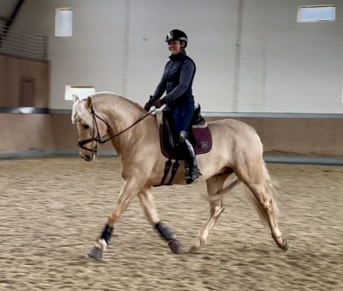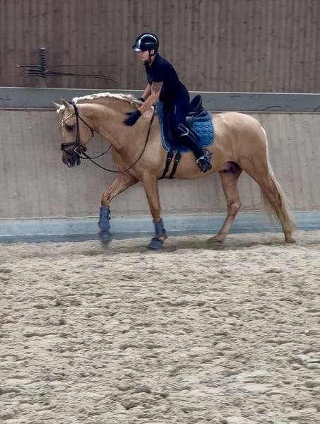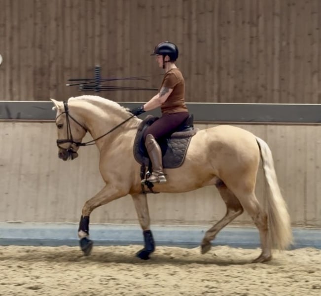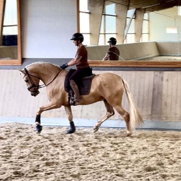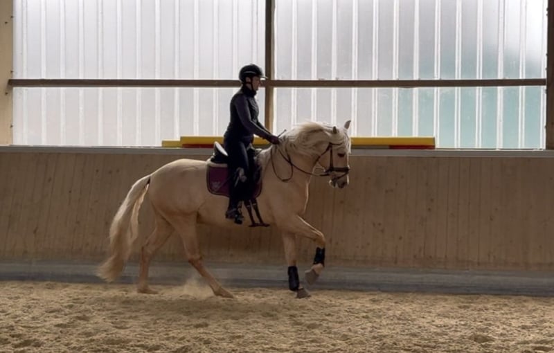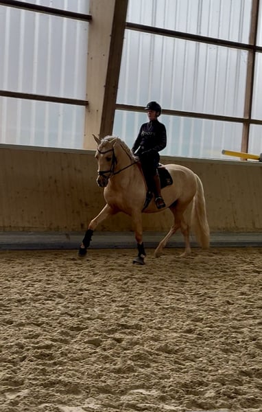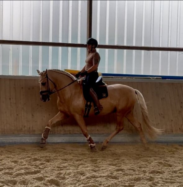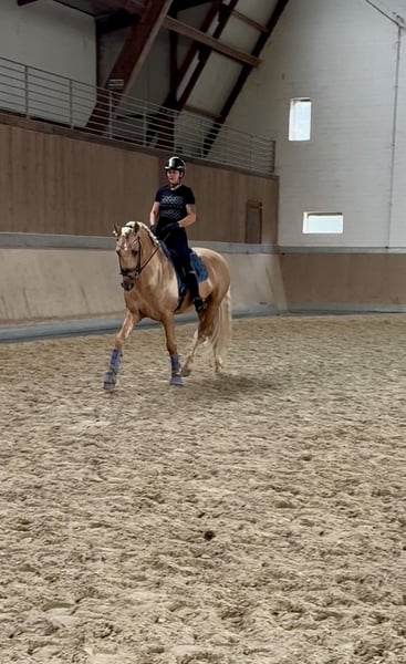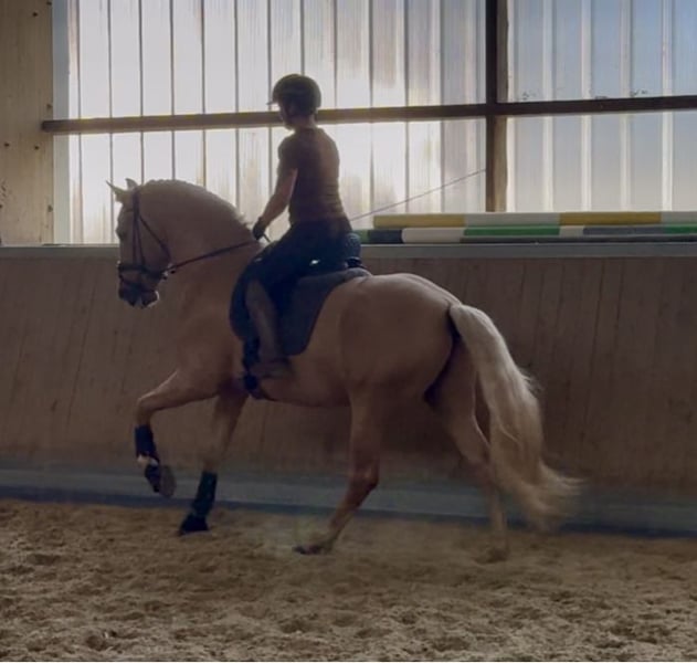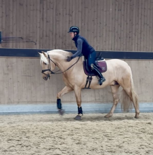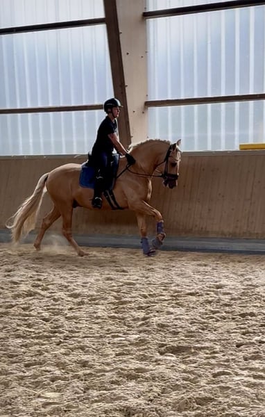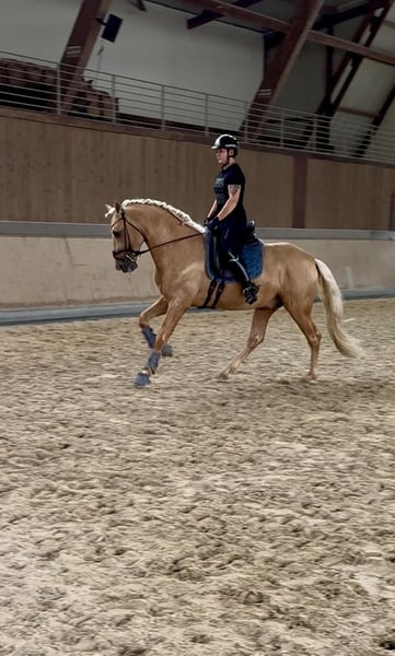 This extraordinary Palomino stallion has been with us since he was 2 years old and has been started under saddle and trained according to his age. He is currently at a safe A-level, and we have now begun working on lateral movements and canter on the outside. Dulzon is always motivated to work and is an absolute sunshine. Dulzon is a safe and balanced horse. He is uncomplicated to handle, trailers well, is good with the farrier, enjoys rides in pairs, and is familiar with the lungeing and water treadmill - he knows all these things. Dulzon has no stallion behaviors. For inquiries, please contact only via WhatsApp at 0171-3776471. Videos are always created on request, as his training level is constantly evolving.