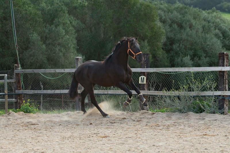 Dieser bildschöne PRE Rapphengst wurde 2020 geboren. Er misst derzeit ca. 1,61m. Schonend wurde er von uns für das Reiterleben vorbereitet. Er wird auf Wassertrense in allen GGA geritten, die Seitengänge, Anfänge Travers, zeigt gute Versammlungsbereitschaft. Freundlich, neugierig, verspielt und menschenbezogen, das beschreibt diesen Junghengst sehr gut. Er zeigt gute GGA mit einem herausragenden Galopp und sehr gutem natürlichen Gleichgewicht und zeigt Talent für fliegende Wechsel Wer einen Rohdiamanten in schwarzer Jacke zum weiter Selbstausbilden sucht, ist hier genau richtig. Er liebt die Freiarbeit, kennt aber auch Stangentraining und die Arbeit an der Hand. Er lernt und versteht unwahrscheinlich schnell. Zu Hause ist er in einer großen Paddockbox mit direktem Kontakt und Anschluss zu anderen Pferden, auch Hengsten. Er ist gewöhnt an laute Maschinen und Fahrzeuge, freilaufende Hühner, Kühe, Hunde und vieles mehr. Röntgenbilder aus 2022 sind vorhanden. Er ist Piro negativ, geimpft, regelmäßig entwurmt sowie dem Schmied vorgestellt. Auf Wunsch kann er vor Ort gelegt werden. Natürlich kann er noch zur weiteren Ausbildung bei uns bleiben. Bei ernst gemeintem Interesse leite ich gerne weitere Informationen weiter. Wir sprechen Deutsch, Englisch und Spanisch. Alle Preise verstehen sich ohne MwSt. und ohne Transport!