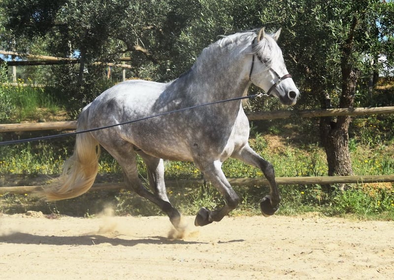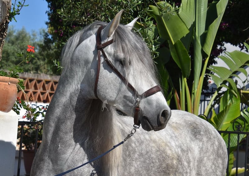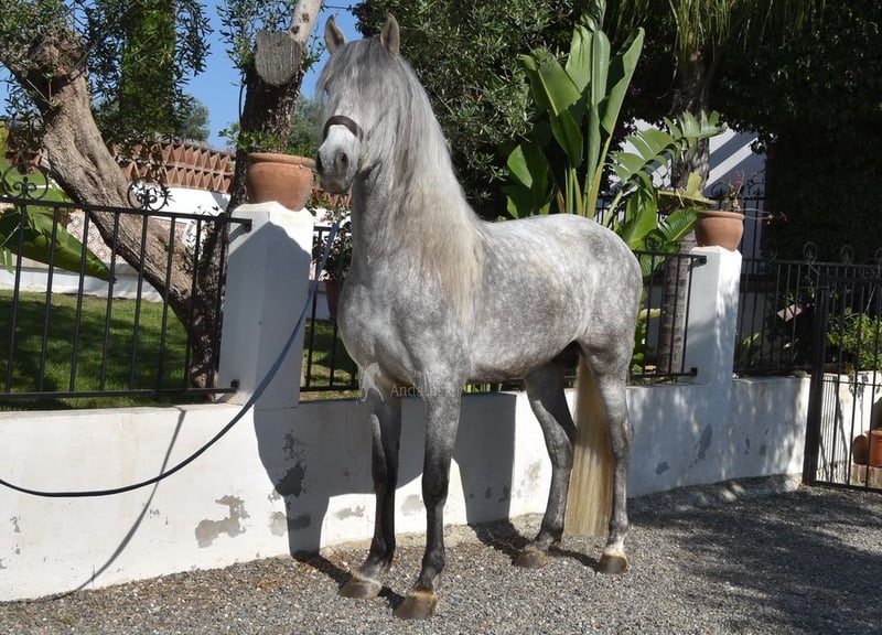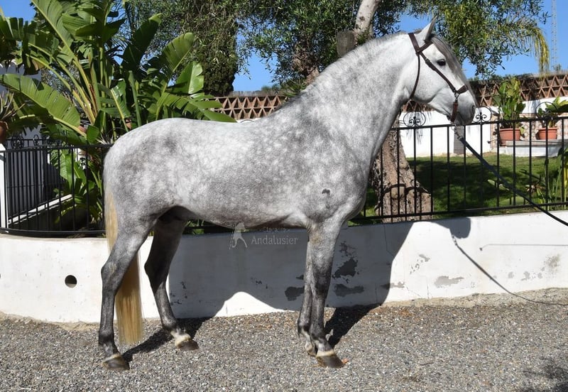 caractère doux, monté un peu dans les allures de base, baroque, très confortable, cheval de canapé, bonnes mouvements et origine, a déjà passé des radios, origine : 100 % Pallares, il a plusieurs ancêtres qualifiés www.elegante-andalusier.com
