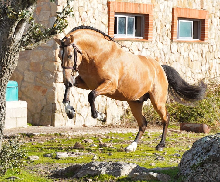 ✨ Buckskin PRE Stallion – Approved for Breeding ✨ Exceptional Pura Raza Española stallion, 6 years old, 1.72 m, with a rare buckskin coat and natural golden shine. A stallion that combines beauty, balance, and rideability. He is easy in handling, correct in conformation, and a natural top mover with elasticity and cadence in all three gaits. ✔ Approved for breeding ✔ Excellent bloodlines, including the Tremendous lineage ✔ Modern PRE type with strong hindquarter ✔ Elegant presence and correct mechanics A refined stallion for breeders and riders seeking quality, movement, and elegance !!!Additionally, he is a baroque-line horse, making him ideal for those seeking a horse with exceptional beauty and character. Don’t miss the chance to own a stallion of outstanding quality. For more information, please do not hesitate to contact us.