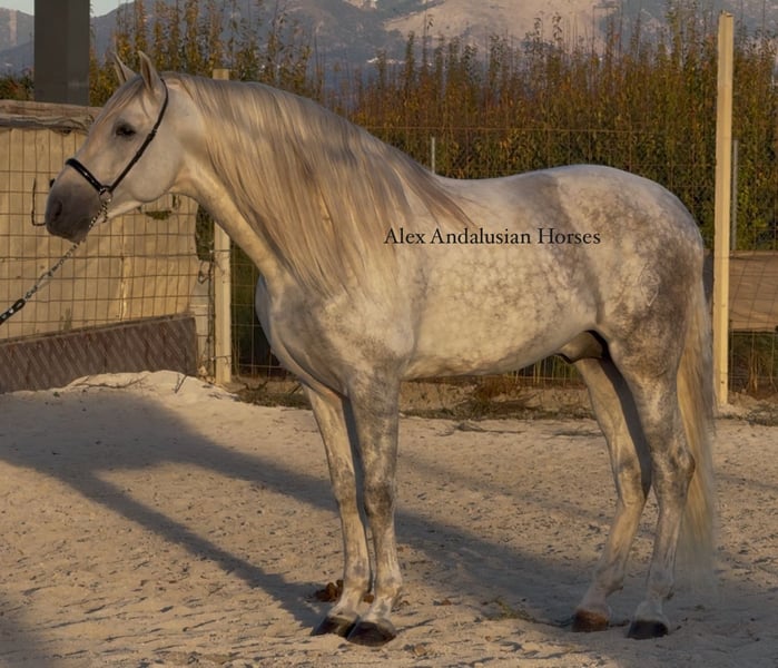 Beautiful PRE stallion with full papers Age: 5 years old Height: 1.73 m (approximately 16.1 hh) A very handsome and impressive young horse Good temperament Nice gaits suitable for dressage or show jumping! Basic training includes riding and Spanish walk Contact us: (+34) 657 314 412 Follow us on social media: “Alex Andalusian Horses”