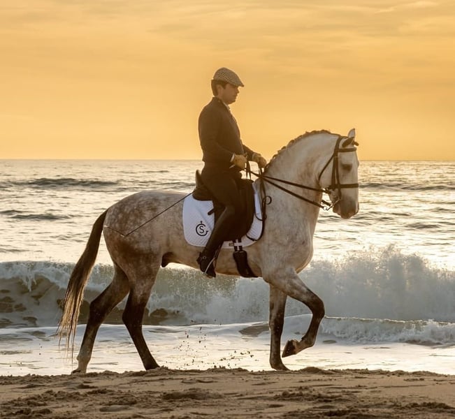 Beduino is a Spanish riding horse suitable for an amateur rider looking for a beautiful and functional mount. An easy horse to ride, pleasant to handle, and representative of the quality horses from the Guardiola stable. This individual is ideal for someone on a limited budget who wants a reliable horse; he has three quality gaits, performs piaffe, lateral movements, flying changes, and can be collected at the canter. "Beduino" is very cooperative in work and would serve as a versatile horse—perfect for dressage training as well as enjoying trail rides or weekend outings. We have veterinary information available and would be happy to provide it. He is a stallion, never covered, and not hot-blooded; he could be castrated or used as a sire if desired. Please do not hesitate to contact us for more information—no obligation.