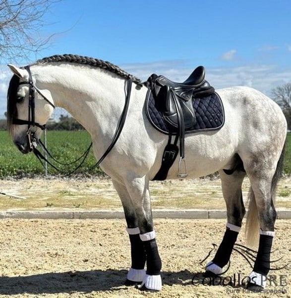 Imponente caballo PRE de sangre pura, de color gris, de estilo barroco y con aprobación, con una altura aproximada de 1,74 m. Está aprobado y ha tenido hasta ahora 6 descendientes. Es libre de piroplasmosis y cuenta con radiografías, incluyendo la columna vertebral, sin hallazgos patológicos. Posee una excelente línea de sangre y proviene de una cría española enfocada en la doma. Naval tiene un carácter excepcionalmente tranquilo y confiable, y en nuestra cuadra no muestra comportamientos de semental. Es muy fácil de montar, siempre respetuoso y sin vicios. Incluso los jinetes en formación pueden montarlo sin problemas. Ubicación: España Si desea más información sobre él, por favor, póngase en contacto con nosotros por teléfono. Con gusto enviamos videos tras una conversación personal. No responderemos a solicitudes anónimas. El transporte puede organizarse a nivel mundial. Las visitas, con cita previa, son posibles en cualquier momento.