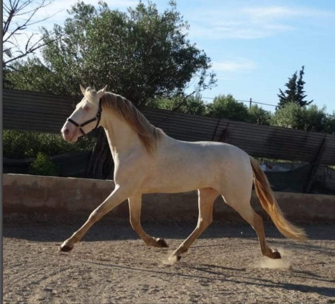 9-jarige PRE pearlino hengst geregistreerd in het ANCCE Stamboek met basis reproductorenlicentie en meer dan 30 nakomelingen. Genetische kleuranalyses beschikbaar op aanvraag. Basis gereden. Goede beweging. Heeft een cataract in zijn rechteroog. Het paard bevindt zich in Spanje.
