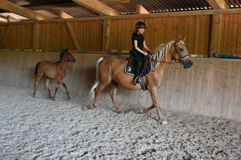 Mar Wendolina was born on June 16, 2014, in Spain. She is a PRE mare in the color Palomino, with the genetic code: gg Aa ee CrC PP. Wendy is 163 cm tall and is registered and approved with the Global Genetic Index: 99.39 at ANCCE. Wendy's father is the well-known Revoltoso XXXIX by Paco Marti. Both sides of Wendy's pedigree trace back to Yegada Militar. Additionally, she has Carthusian blood on her father's side, which is reflected in her strong nerves and clear-headed character. Wendy is absolutely well-behaved and well-mannered. She is an excellent mother. So far, she has had 4 foals: one chestnut colt and three cremello fillies. Wendy is ridden and has a very expansive walk and trot. She is popular among riding students because she is friendly and always tries to do everything right. Wendy also enjoys liberty dressage. She has her fifth foal at foot and is in foal for spring 2026 to Flamenco. She is good for the farrier and loading. Mother: Templaria VII, Father: Revolotos XXIX, Maternal Grandfather: Genro