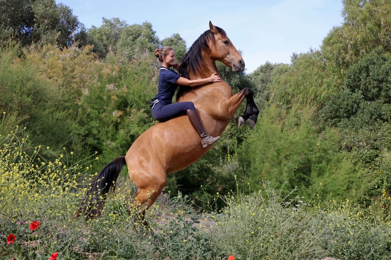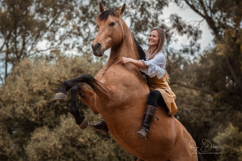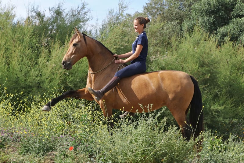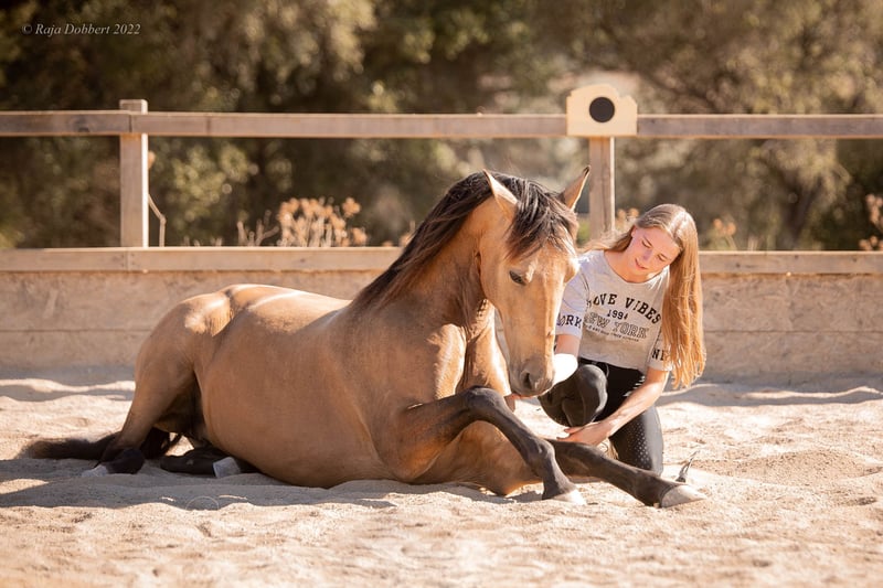For personal reasons, I am looking to place my mare in new loving hands. Buena is a dream horse in a special color, who simply brings joy to work. She has extensive training in groundwork and liberty work, responds sensitively to body language, and is being trained with a mix of horsemanship and classical riding art. So far, she has been ridden completely bitless. Buena's favorite activities are liberty work, including many tricks. She is full of energy and loves to show what she can do. These include: - Spanish walk - Spanish salute - Rear up - Collected halt - Twist (turning around her own body) - Sit - Backing up towards you - Side leaps - Bow - Podium and horse seesaw Buena's new owner should also bring joy to groundwork and liberty work. Under saddle, she can perform the basics such as leg yielding, shoulder-in, and turns on the forehand and hindquarters. Parking assistance included. She also goes wonderfully and relaxed in the outdoors, but she is only used to going out in a group. Going out alone would need to be learned. Buena is only accustomed to herd living and will only be sold into a herd. She is very sociable, whether with other mares or geldings. I bought Buena unbacked at 3.5 years old. She has lived with me in Spain so far but has been in Germany for a few months. The reason I am offering this dream horse at such a low price is that Buena is currently recovering from an injury. Since I am moving and do not want to integrate Buena into a new herd for a short period, I am already looking for a new owner. Thus, it is a unique opportunity for a unique horse at a great price. Once Buena is fit again, her price will increase. In my opinion, she can recover just as well with her new owner. I know she will be fit again; she just needs some time. If you are interested, I look forward to hearing from you. I will, of course, provide detailed information about the injury. Melina
