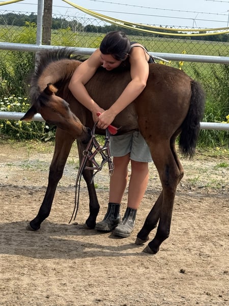 La nostra piccola Treidelhof Octava è venuta al mondo in un perfetto baio castano, completamente priva di segni bianchi. Si muove con molta energia, ritmo e si presenta molto equilibrata in tutte le andature. Octava si lascia mettere il capestro senza problemi e sta imparando a dare i suoi piccoli zoccoli. È curiosa e molto affettuosa verso le persone. La diamo solo in mani eccellenti. È un puledro davvero speciale. Per gli appassionati di PRE, è interessante sapere che dal lato materno porta il 70% di sangue Escalera e dal lato paterno discende dalla meravigliosa e famosa linea di Martinez Boloix. Per Octava, come per tutti i nostri cavalli in vendita, desideriamo innanzitutto una persona gentile e responsabile, che si prenda cura di sé e del cavallo con attenzione e pazienza. I nostri cavalli sono completamente integri e hanno avuto solo esperienze positive. Un ambiente affettuoso e premuroso è per noi fondamentale. Octava cresce, come tutti i nostri giovani cavalli, in un gruppo/famiglia. Vi preghiamo di contattarci solo personalmente. Non daremo mai informazioni sui nostri cavalli in modo anonimo. Desideriamo un contatto personale amichevole e siamo sempre disponibili ad aiutare su richiesta. Siamo anche molto felici di ricevere foto e racconti dei nostri ex cavalli.