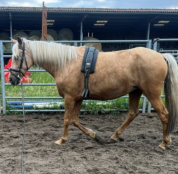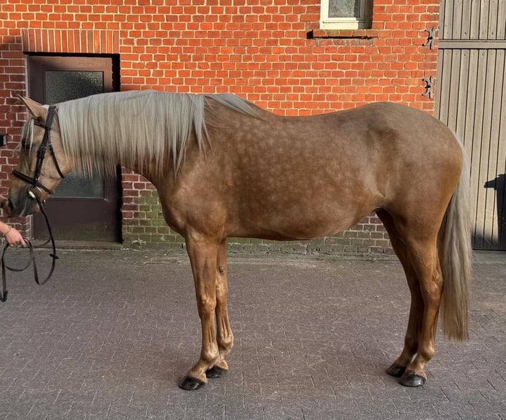 This stunning PRE mare in a special Palomino color is searching for her soulmate. She has a sweet, open, and friendly character and loves to explore new things with her human partner. She is 7 years old and approximately 16.1 hh. Her life has so far been spent in a small hobby farm herd, and she has already given birth to two healthy foals (a chestnut mare with Prl and a Cremello stallion). For this reason, she has not yet been backed under saddle, but she has always been handled from the ground, so she is familiar with human interaction and work, and she always approaches with kindness and motivation. This means she can be easily backed in her new home. In her new environment, she could be suited for many disciplines—whether continuing in breeding or dressage, working in Working Equitation, showing, or simply as a leisure partner. She spent her childhood on pasture with a large herd of mares and foals. She comes from a private owner and was intended to remain a broodmare in a small private breeding farm with a family atmosphere. Unfortunately, due to personal reasons, the family has to part with their hobby farm and this beautiful mare, and they are now looking for an excellent new home for her. Location: East Westphalia, Germany