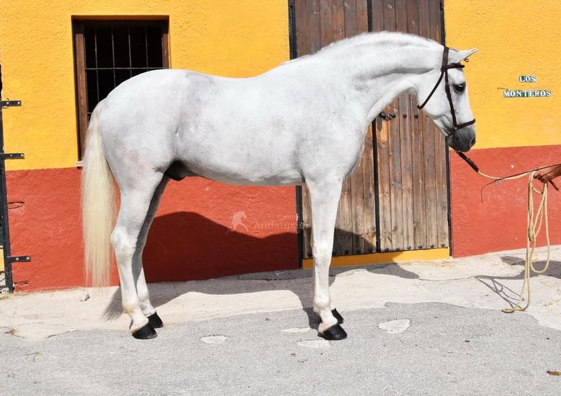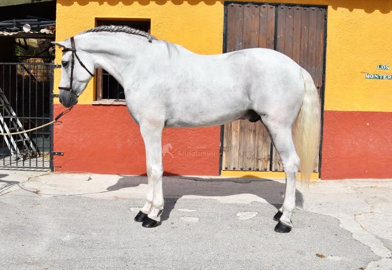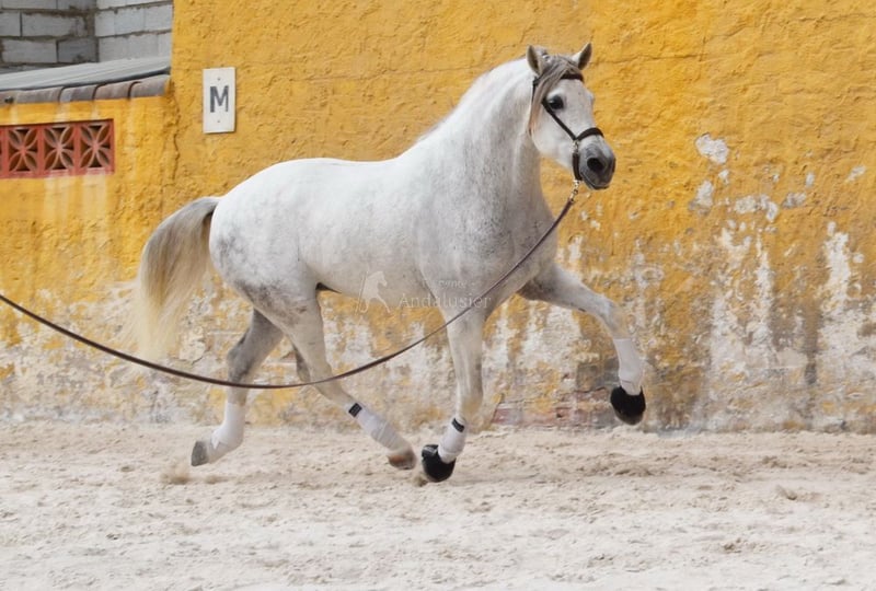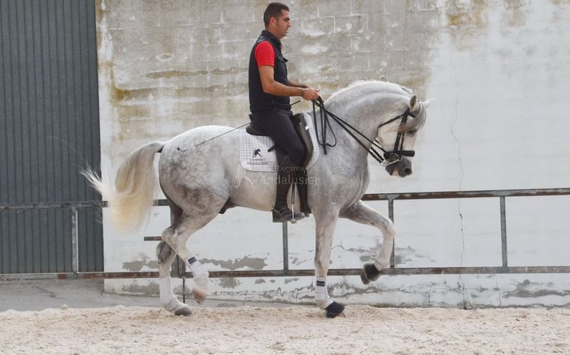 caractère aimable avec un tempérament agréable, trot moyen, allures latérales, reculer, galop extérieur, pirouettes au galop, changements de pied au galop à la volée, pas espagnol, piaffer, passage, terrain, grand, baroque, bonne ascendance, a déjà des radios et est Piro négatif, ascendance : Yeguada Militar, Yeguada Quintanilla, Lovera, San Roman, Opa Lobito IV et Uropa Fatuo de Nadales sont qualifiés www.elegante-andalusier.com